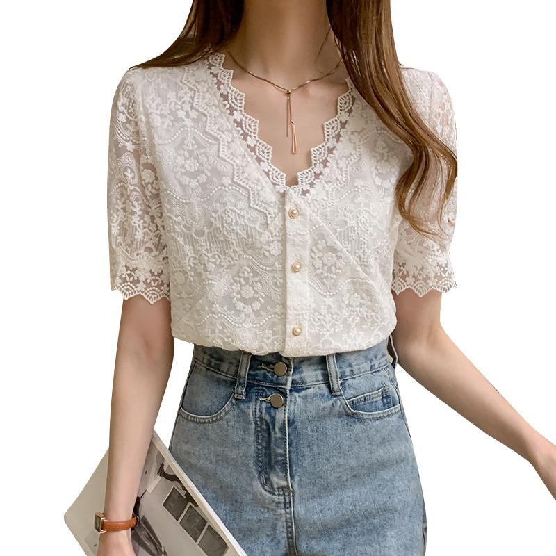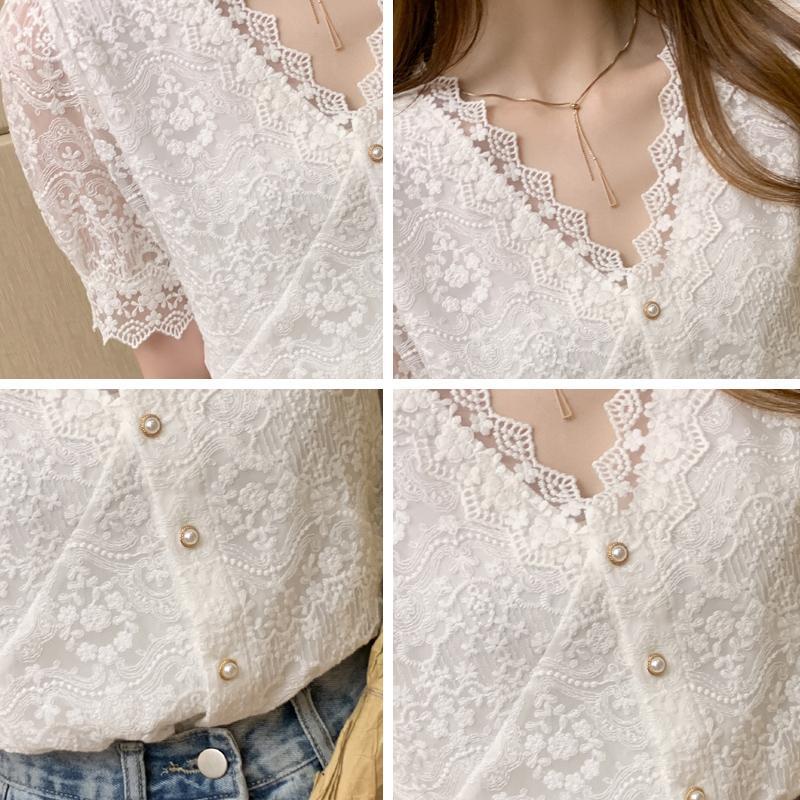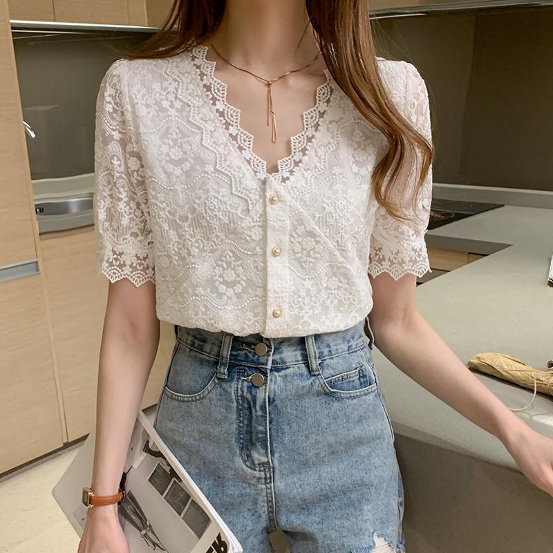 夏季新款韩版百搭V领花边拼接V领小个子短袖镂空衬衫女上衣夏
