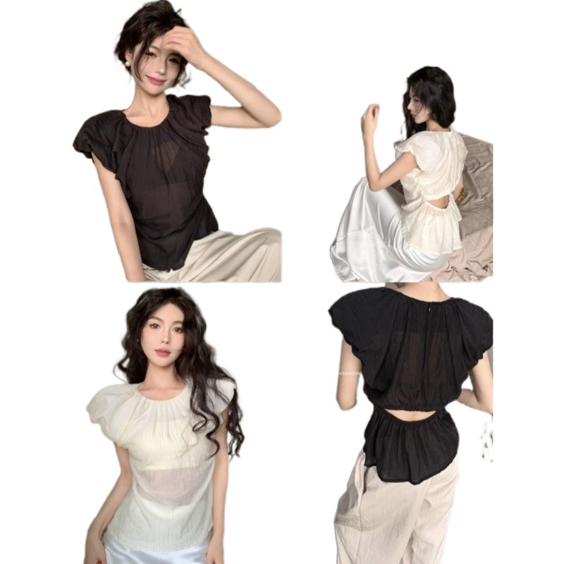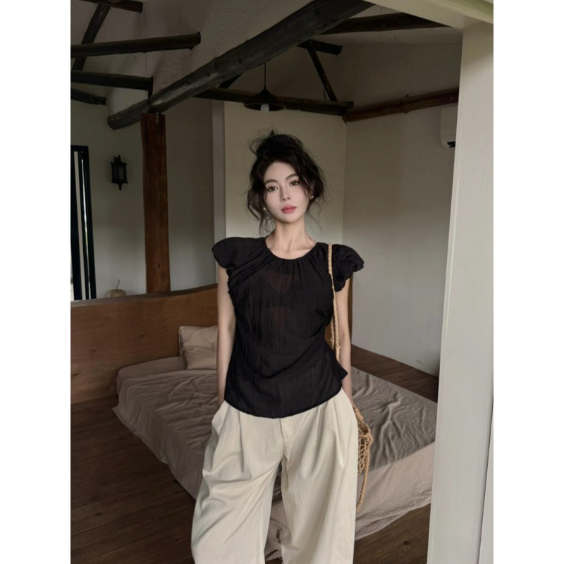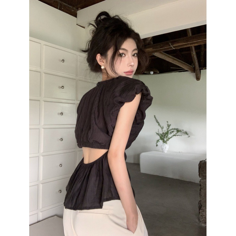 夏季法式气质圆领泡泡袖收腰娃娃衫小心机露腰褶皱无袖上衣