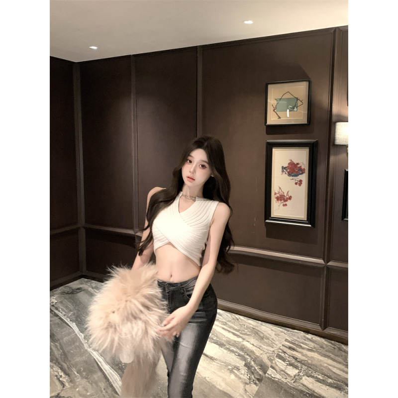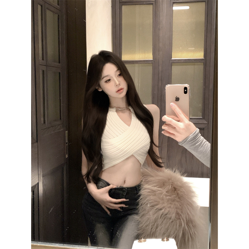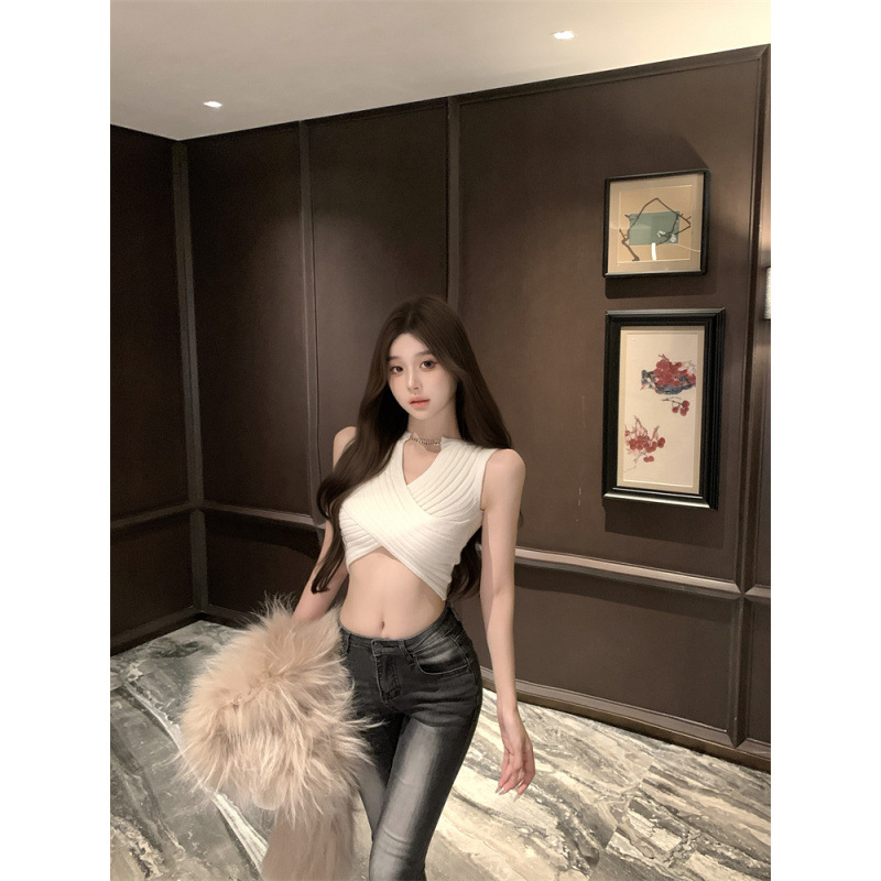 交叉设计感白色短款针织上衣纯欲性感背心女