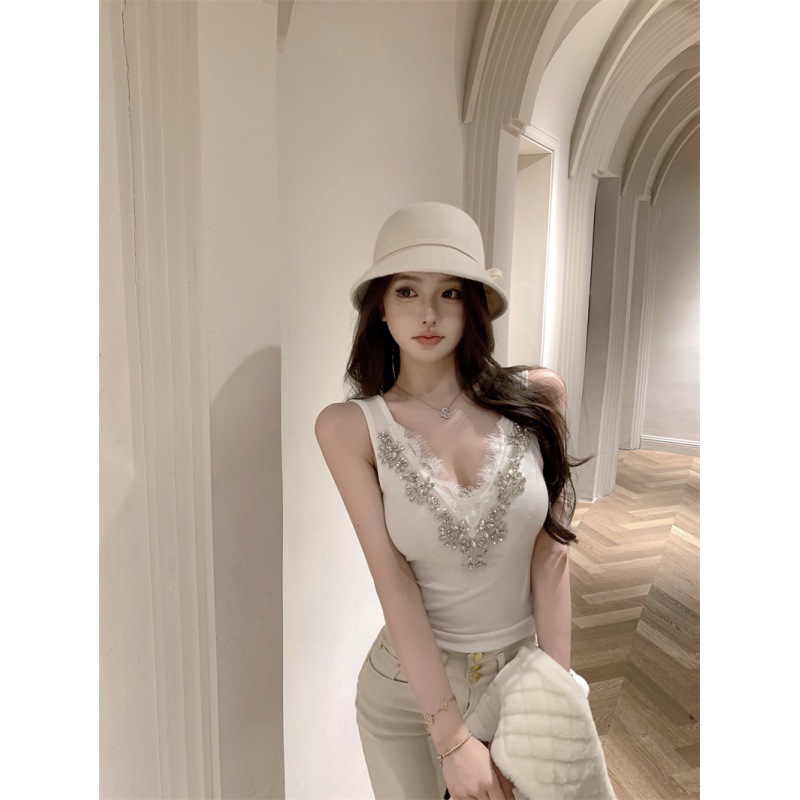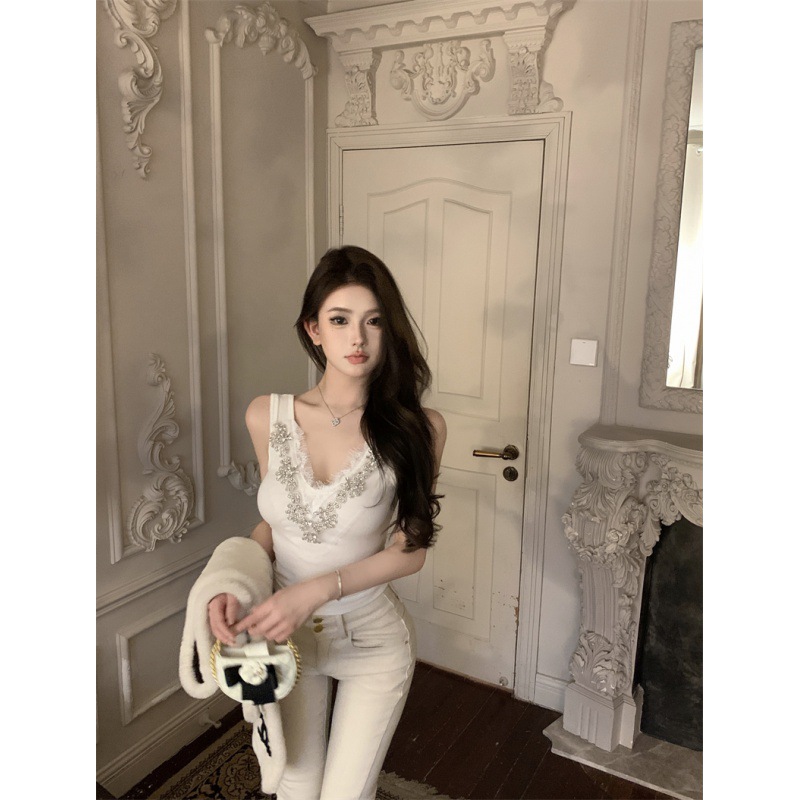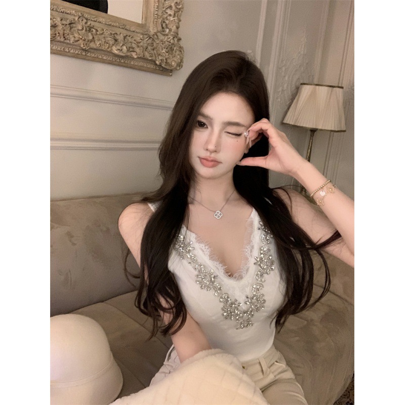 新款名媛纯欲重工水钻蕾丝拼接V领修身背心吊带女上衣
