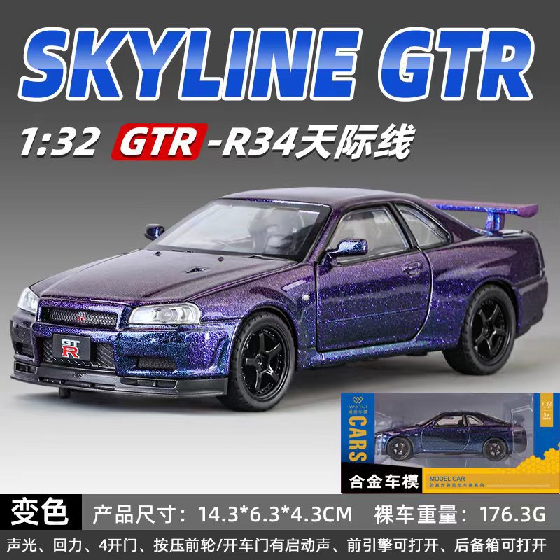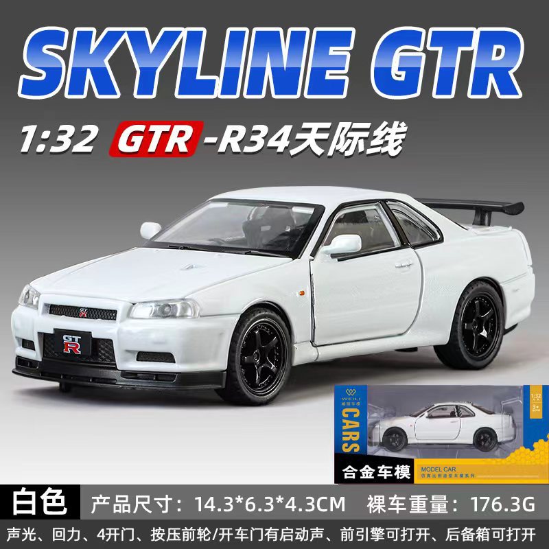 威丽合金车模1比32日产GTR34跑车声光回力玩具车音效模型摆件