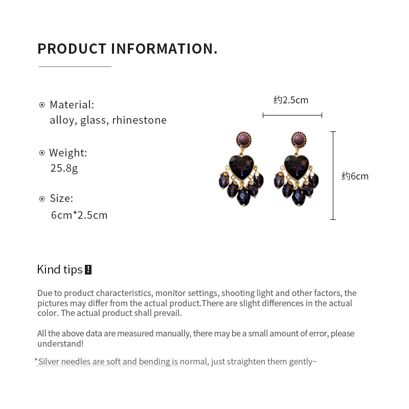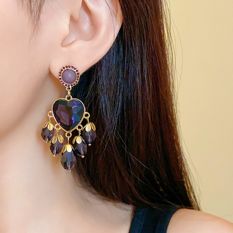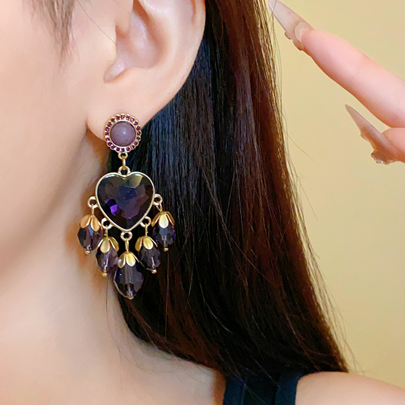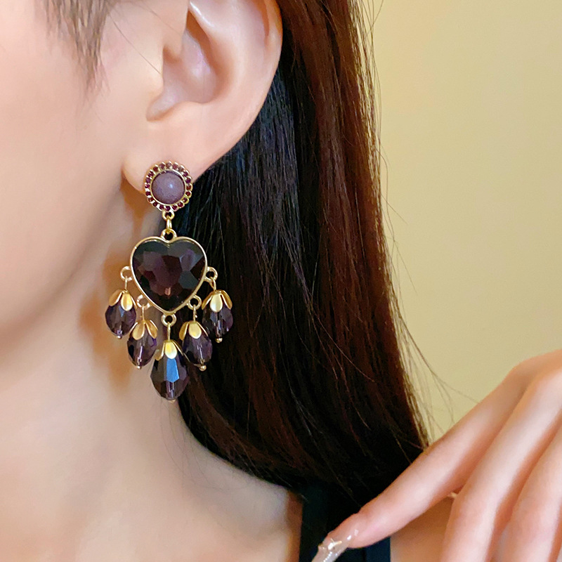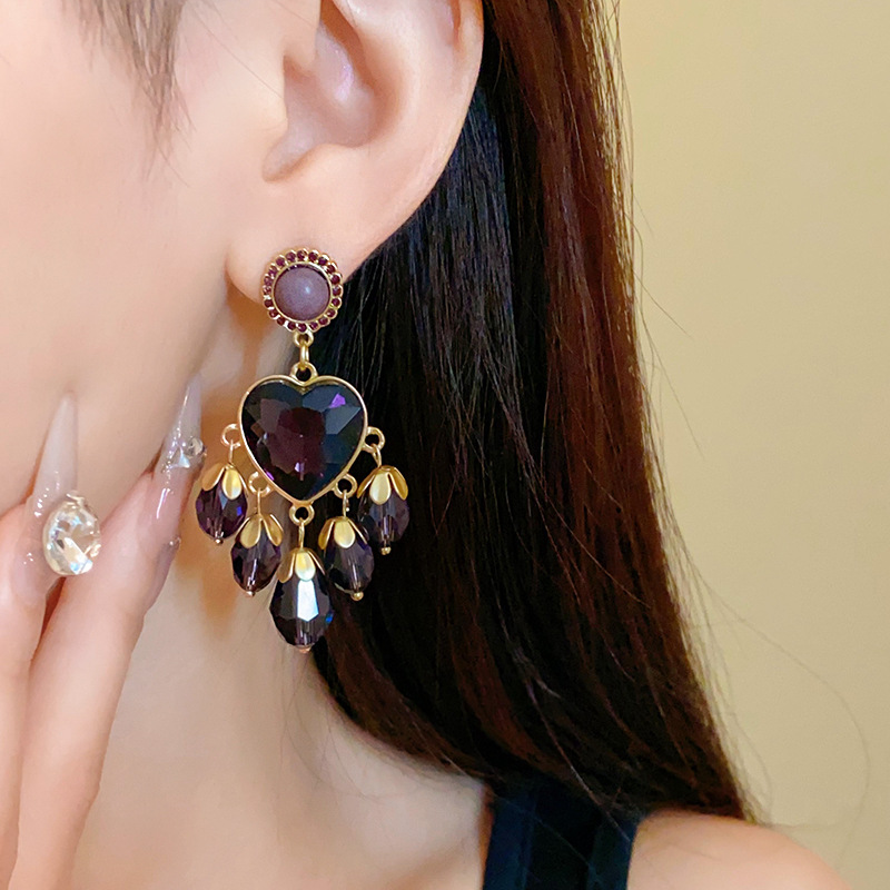银针镶钻紫色爱心水滴流苏耳环法式复古气质耳坠高级感中古耳饰女