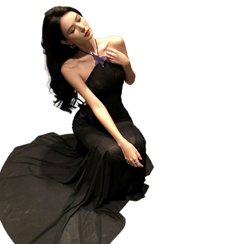 越南小众蝴蝶挂脖镂空连衣裙露背显瘦鱼尾礼服长裙夏度假裙
