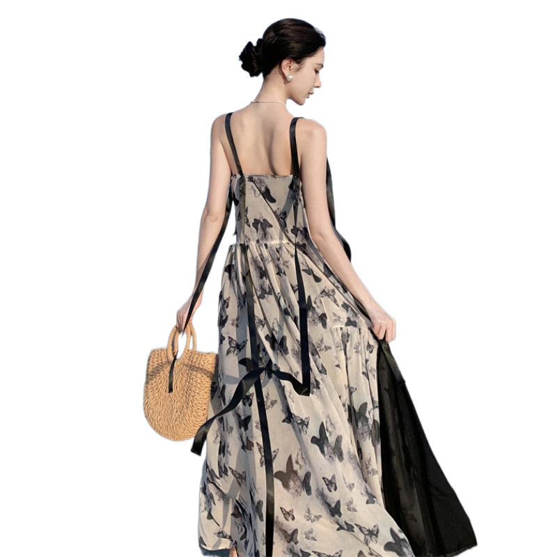 水墨画蝴蝶吊带连衣裙女夏法式慵懒海边度假超长款到脚踝沙滩裙子