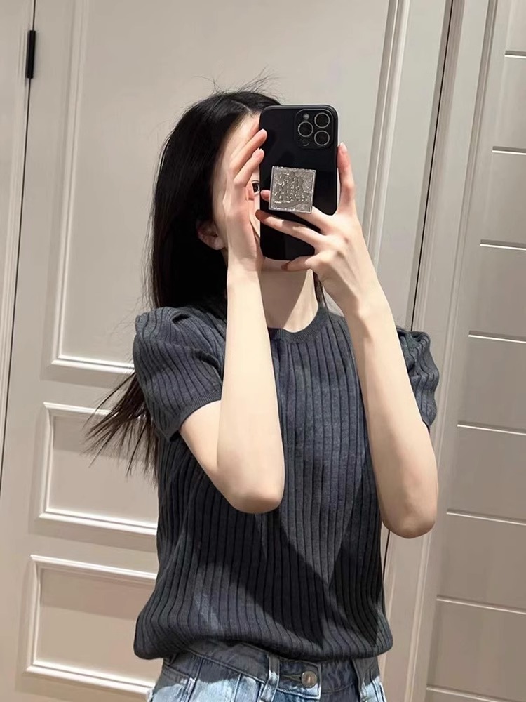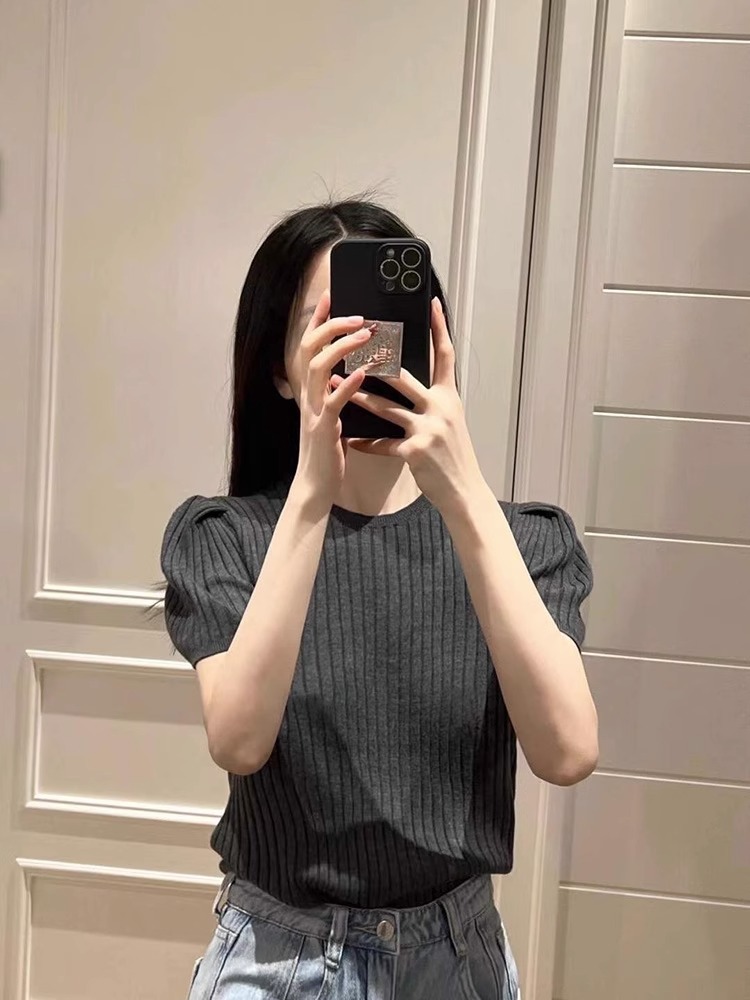 设计感黑色坑条针织衫女新款法式复古软糯气质泡泡袖上衣服