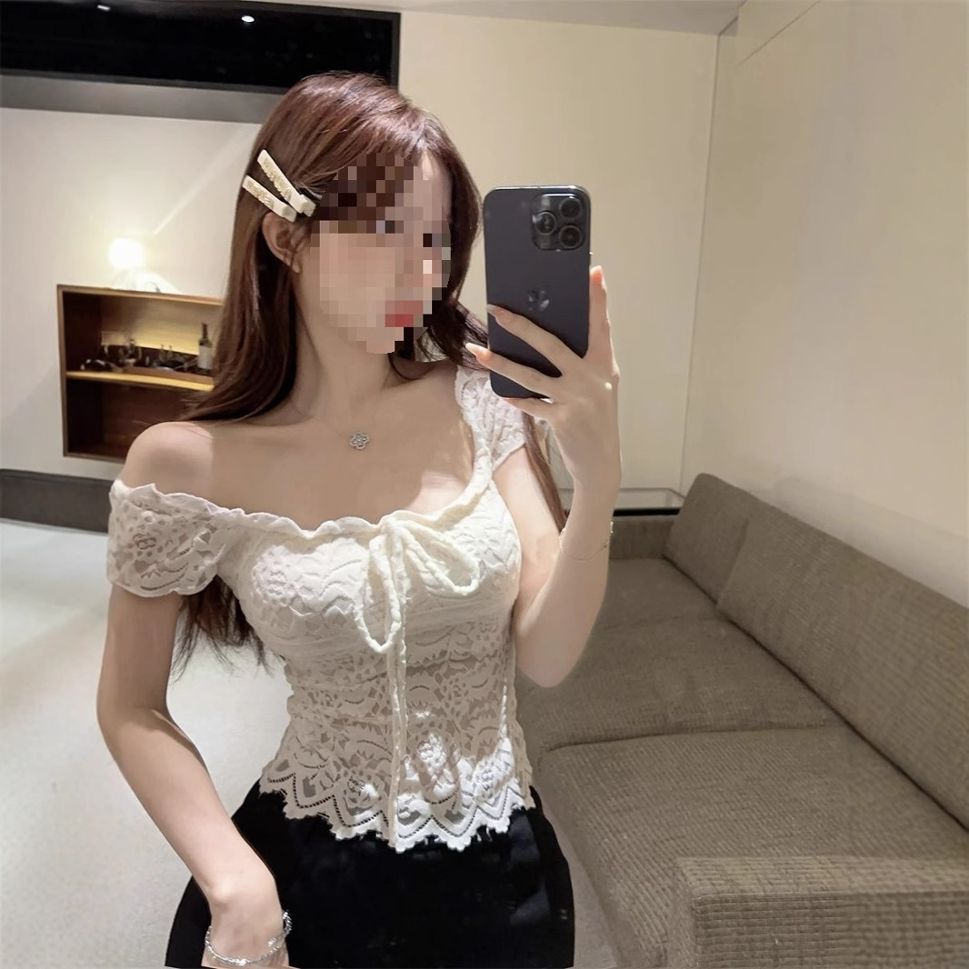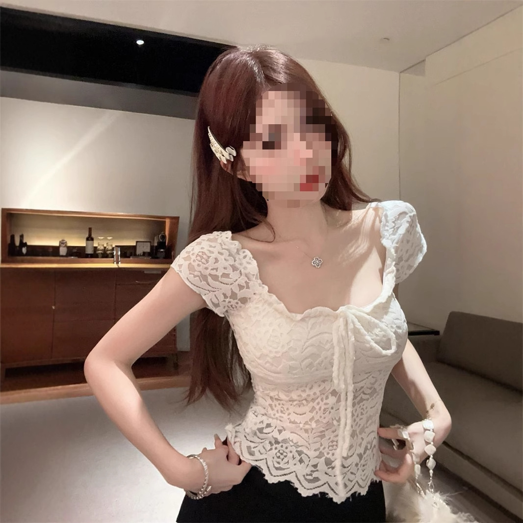 法式复古蕾丝钩花蝴蝶结方领短袖T恤女夏纯欲绝美收腰显瘦上衣潮