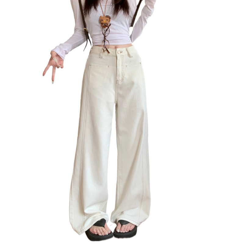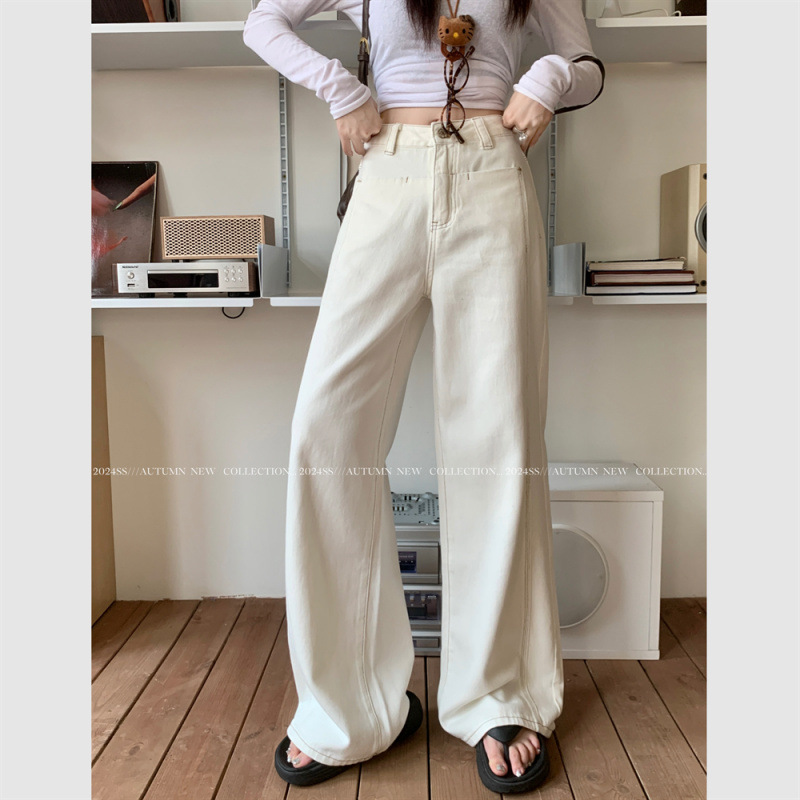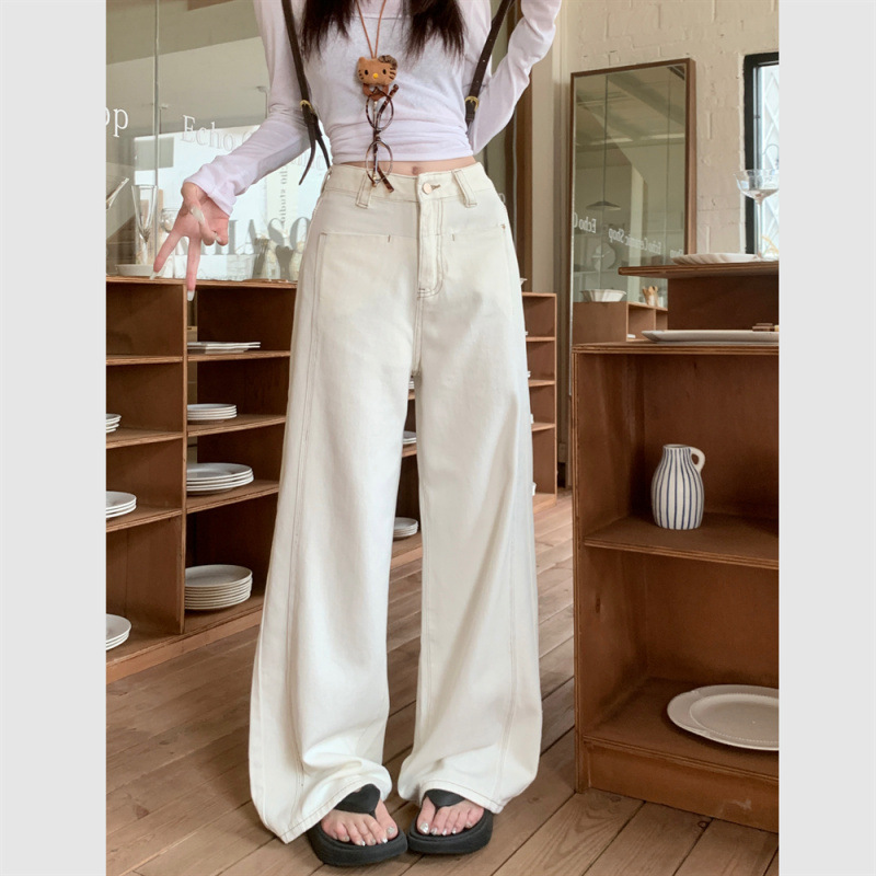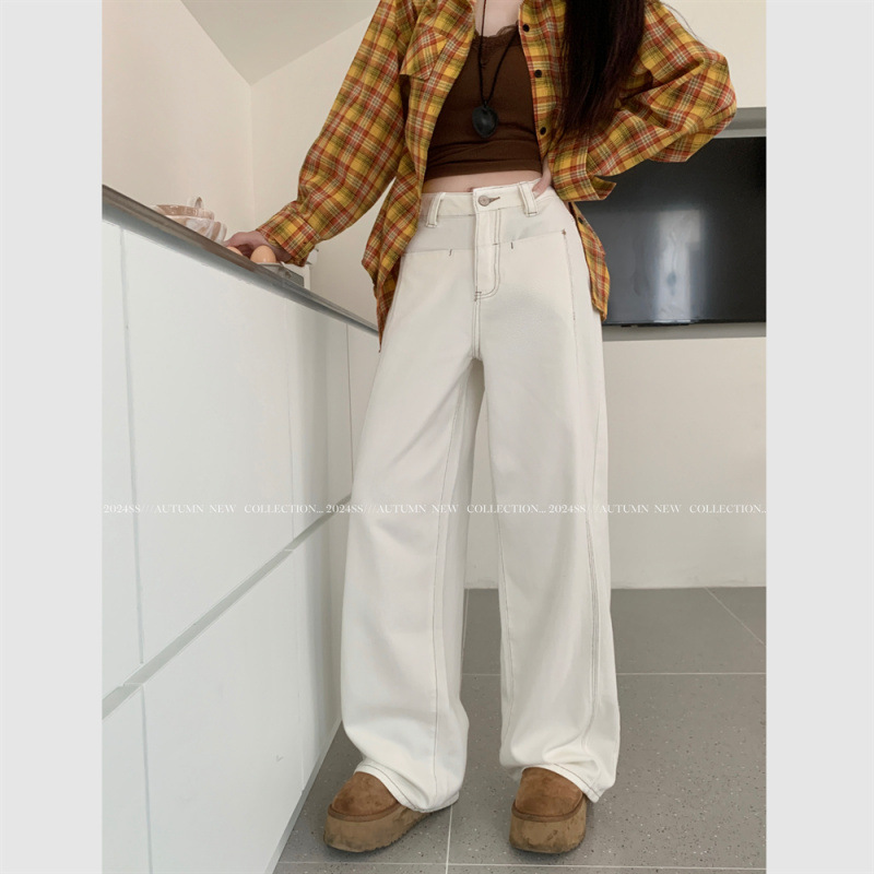 明线分割设计美式白色高腰直筒牛仔裤拖地宽松阔腿裤女