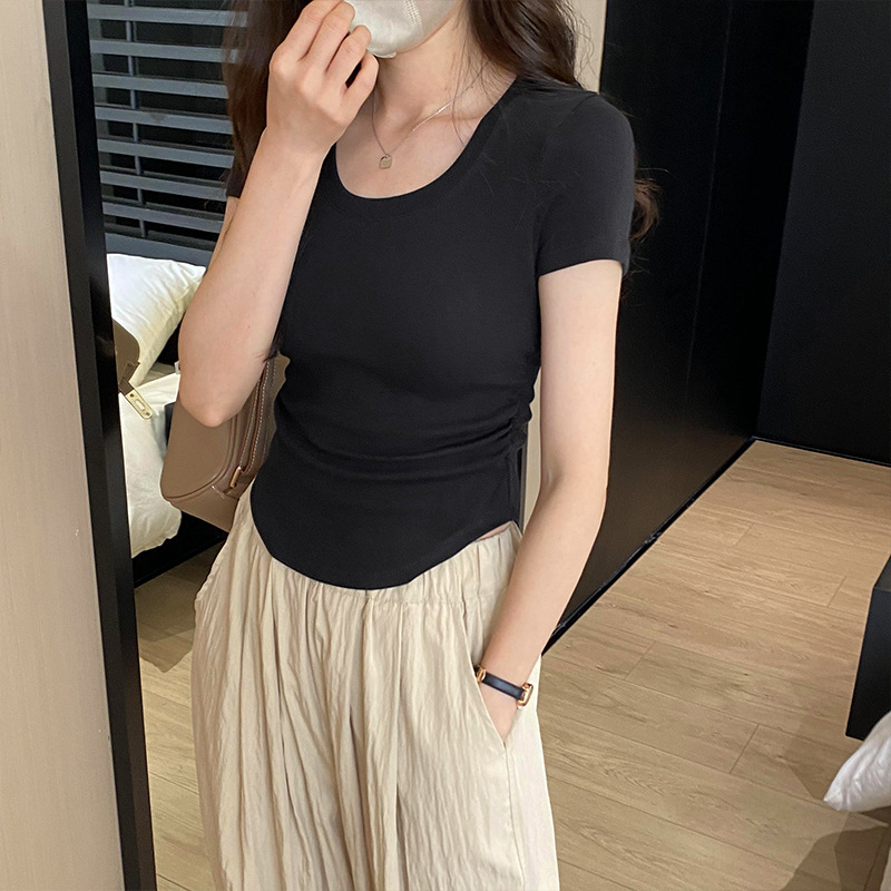 欧美甜辣风U领短袖T恤女抽褶不规则设计感夏新款修身百搭上衣