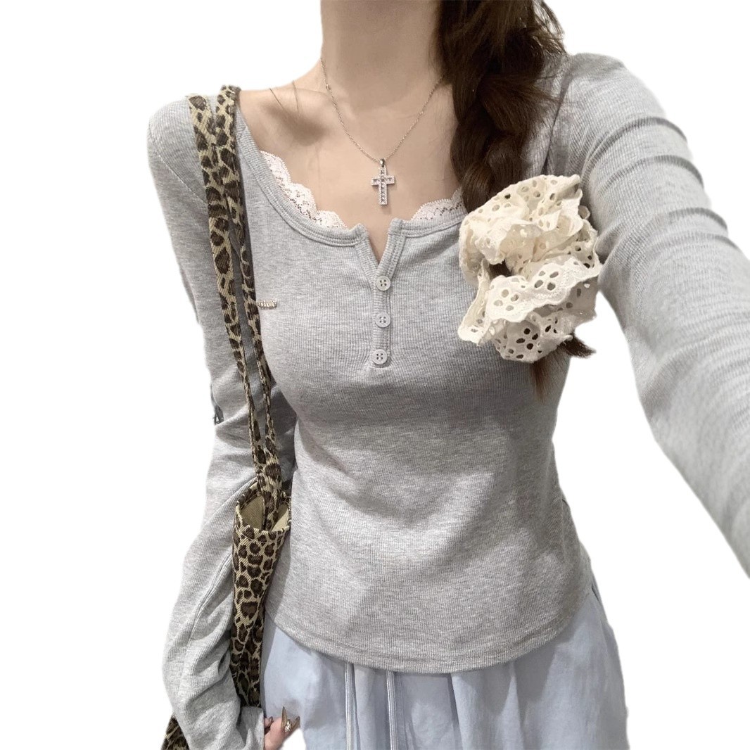 韩系纯欲蕾丝拼接长袖正肩T恤春秋时尚内搭打底衫温柔上衣女