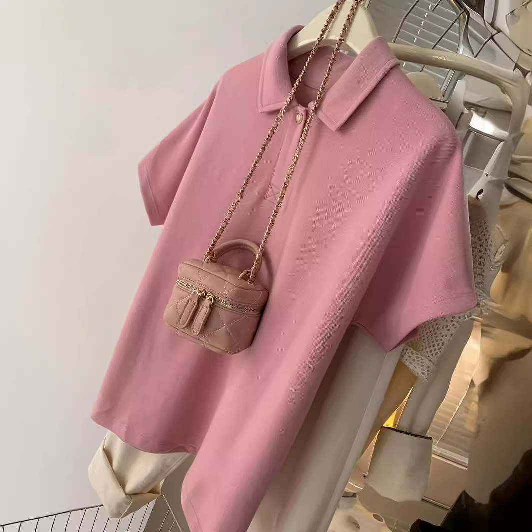 时尚显瘦多巴胺上衣polo翻领短袖t恤宽松连肩上衣纯色小众设计感
