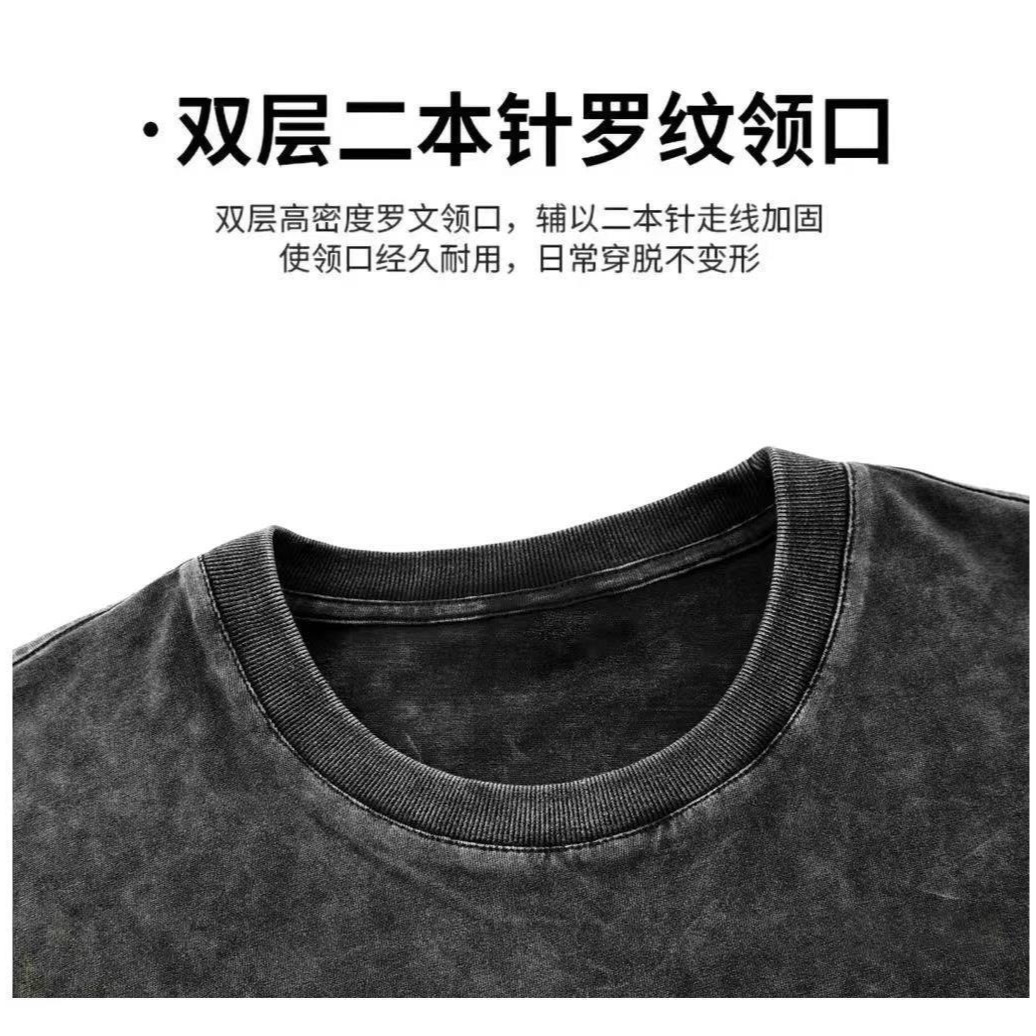 美式休闲夏季春夏宽松灰色圆领大码水洗做旧黑色纯色落肩重磅短袖