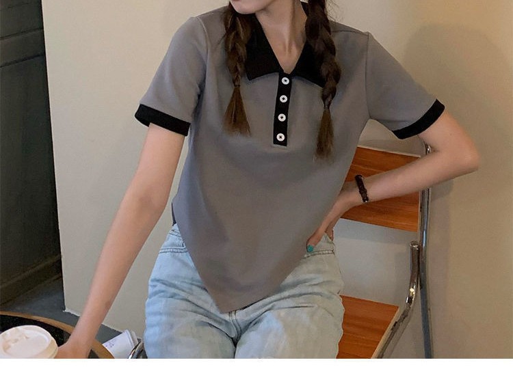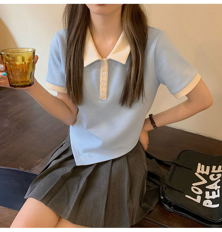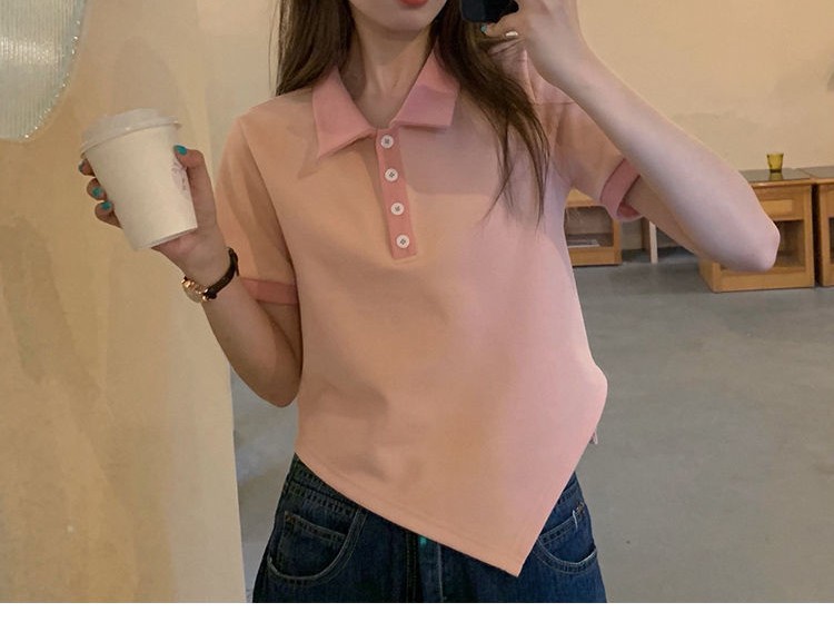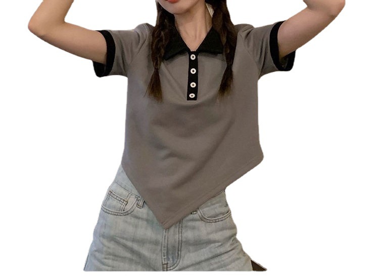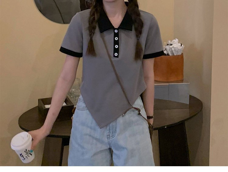 大码女装正肩短袖t恤女设计感夏季polo领翻领不规则显瘦短款上衣