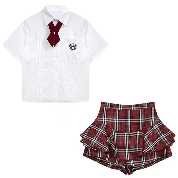 白色长袖上衣+格子裙(套装)