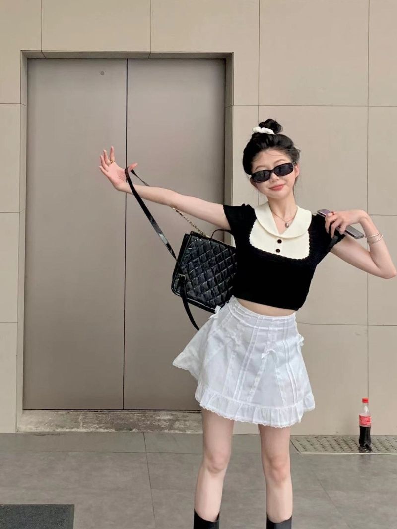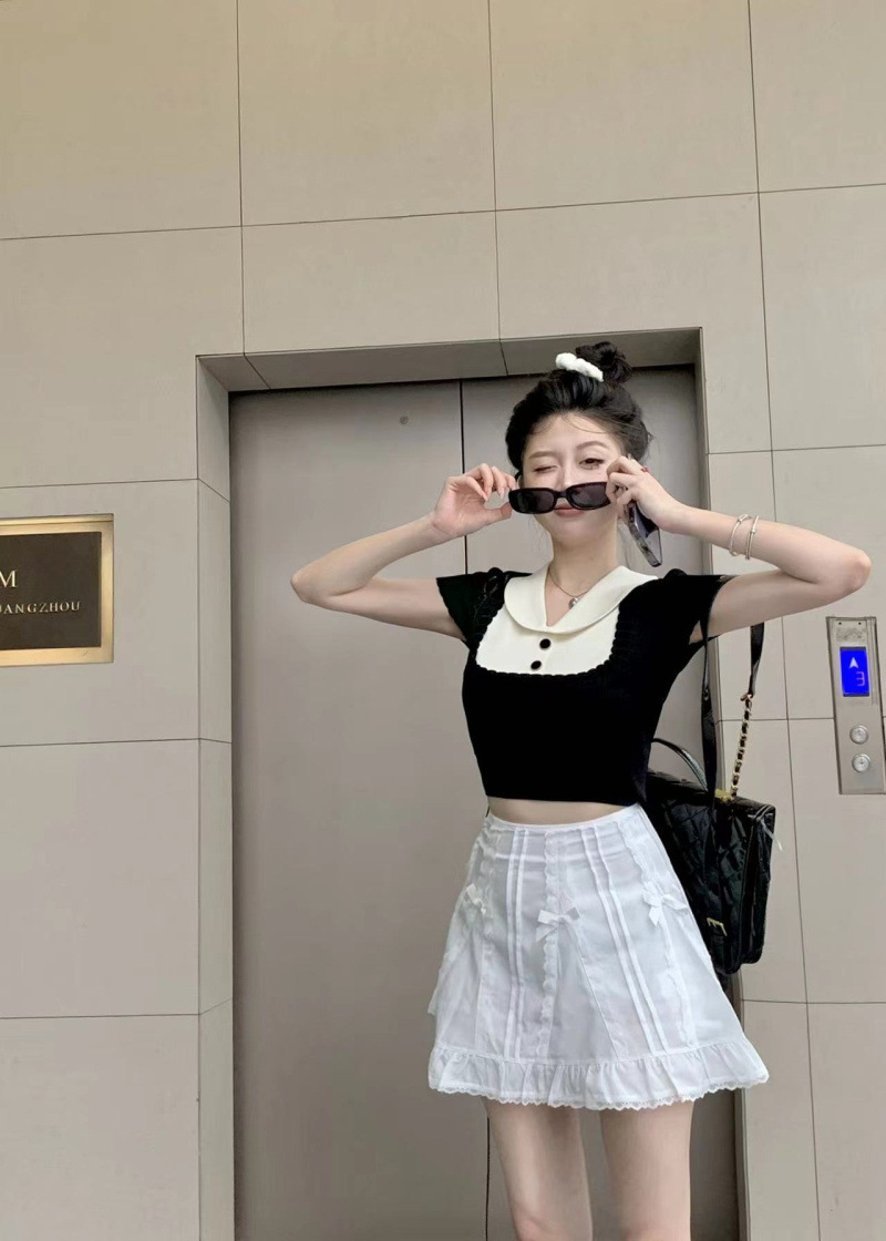 法式娃娃领短袖针织衫上衣女夏季学院风新款撞色短款修身T恤