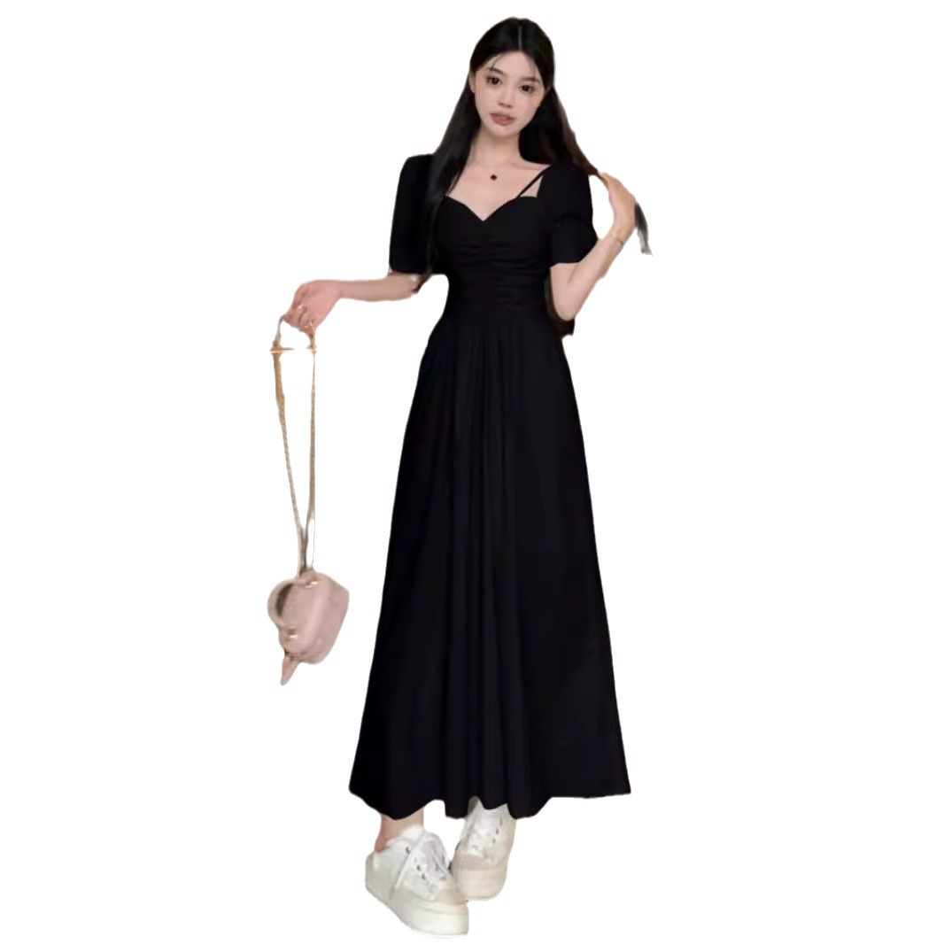 大码法式方领连衣裙夏季胖mm显瘦遮肚收腰气质轻熟御姐赫本风长裙