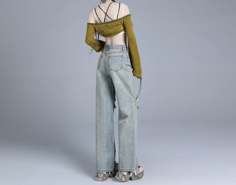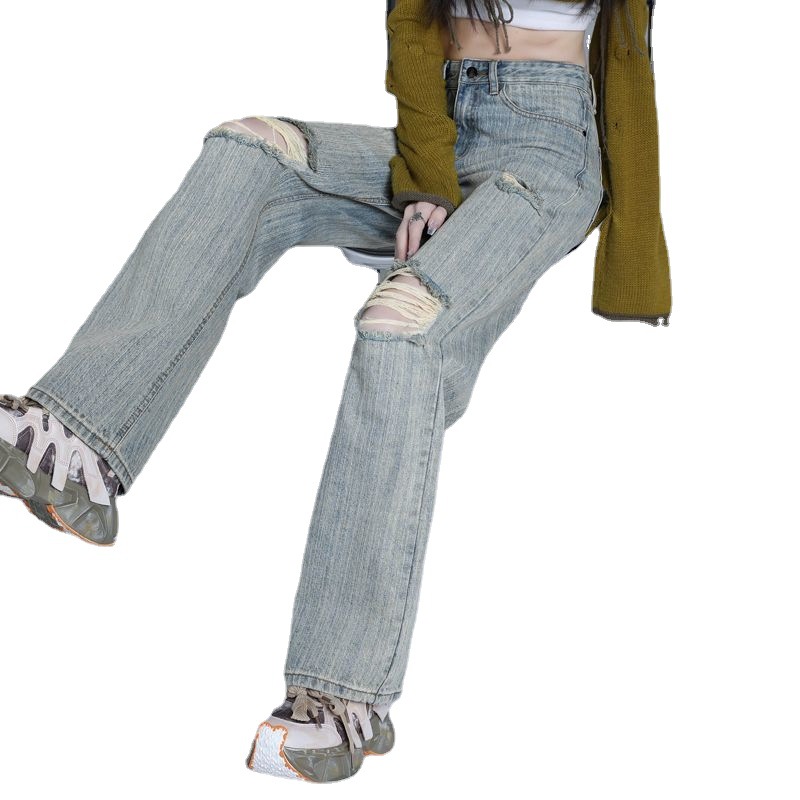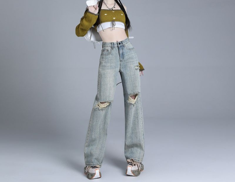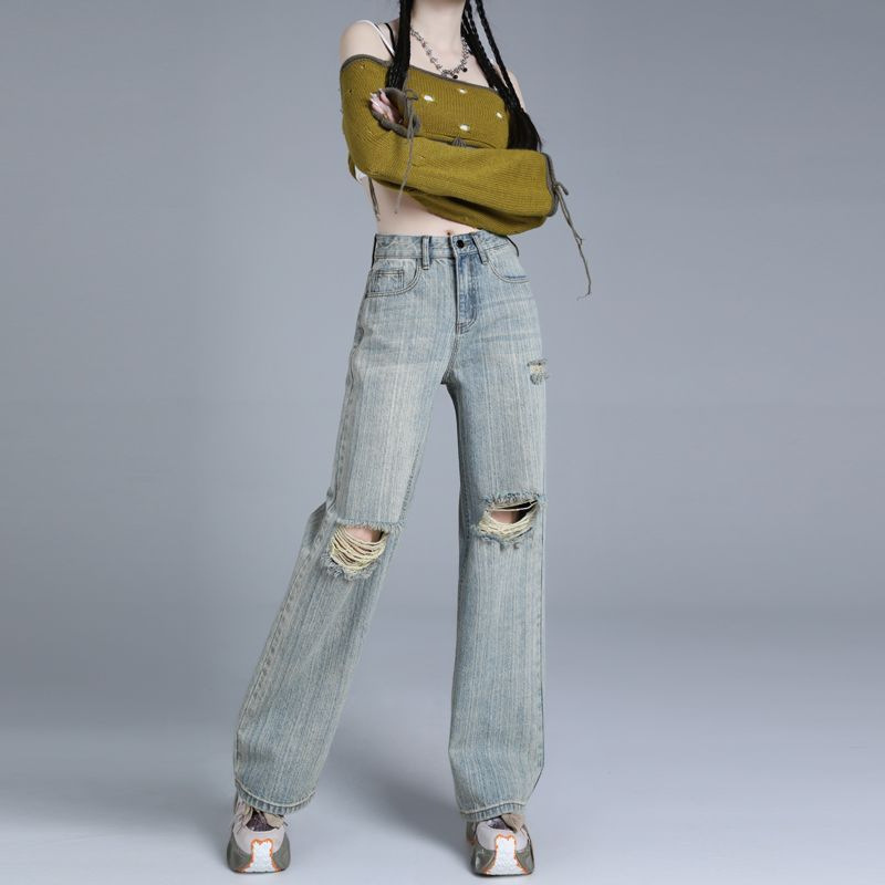 新款夏季复古风做旧浅色纹理高街窄版破洞牛仔裤宽松阔腿高腰显瘦