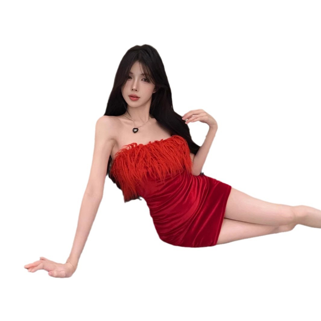 设计感气质纯欲性感辣妹毛毛抹胸包臀红色丝绒裹胸宴会褶皱连衣裙