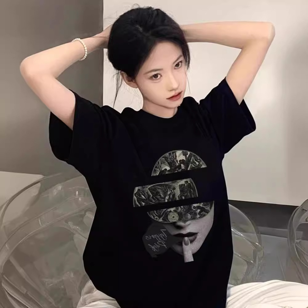 纯棉美式复古街头嘻哈人脸印花短袖T恤女夏季宽松大码潮牌上衣服