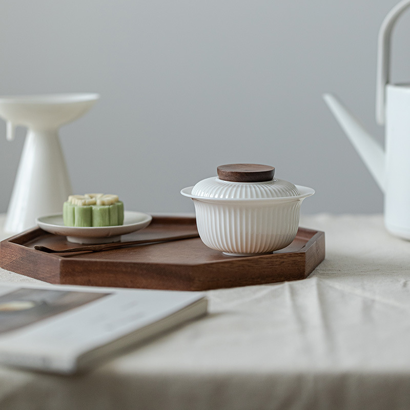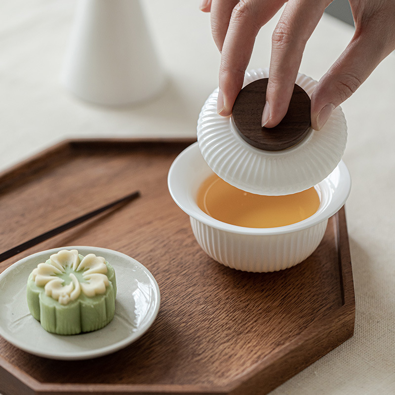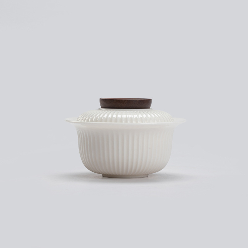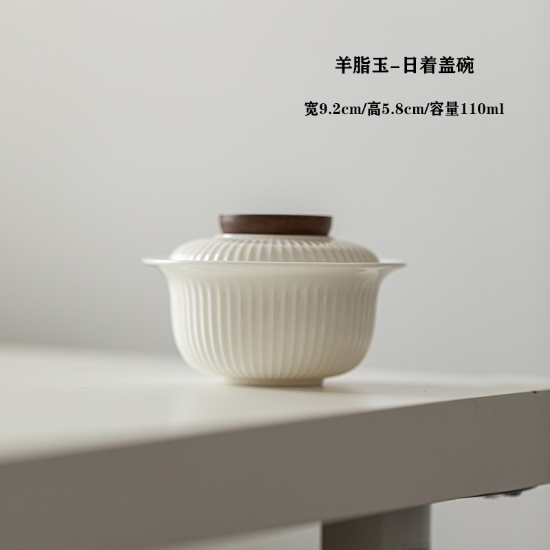 羊脂玉白瓷盖碗二才泡茶碗木盖钮不烫手竖纹薄胎陶瓷功夫茶具