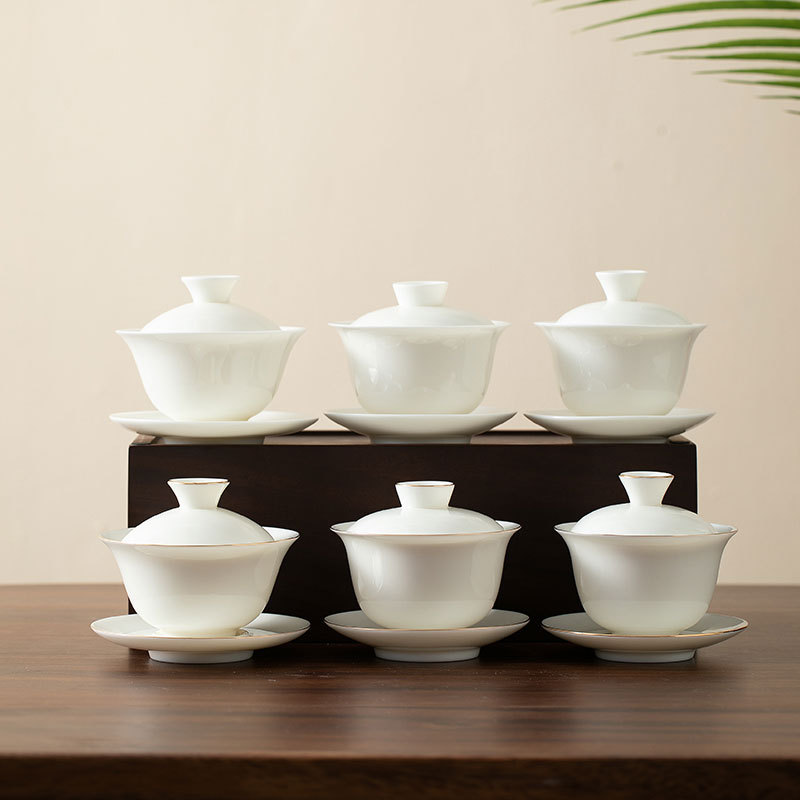 茶具羊脂玉三才盖碗套组不烫手茶杯金边茶碗家用盖碗