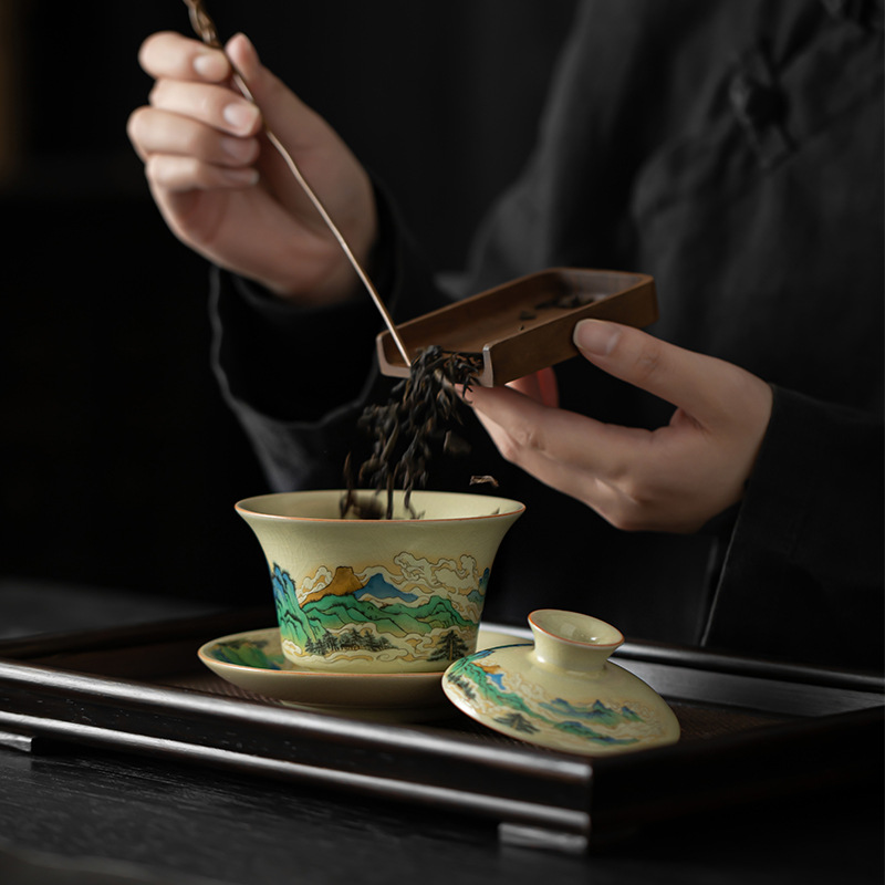 可悬停旋转米黄汝窑盖碗泡茶不烫手汝瓷功夫碗三才带盖陶瓷