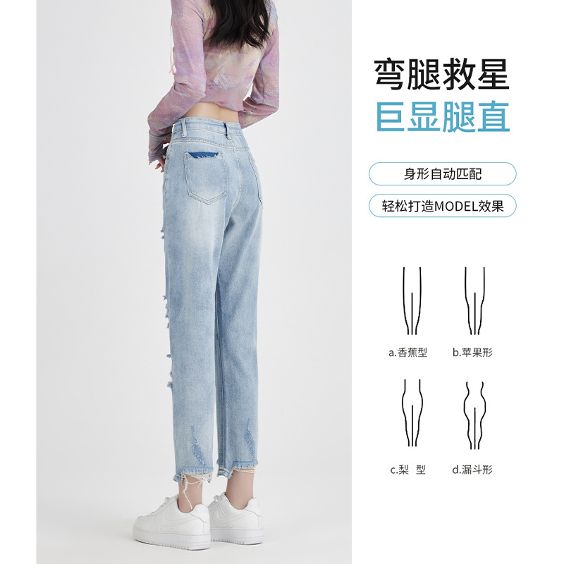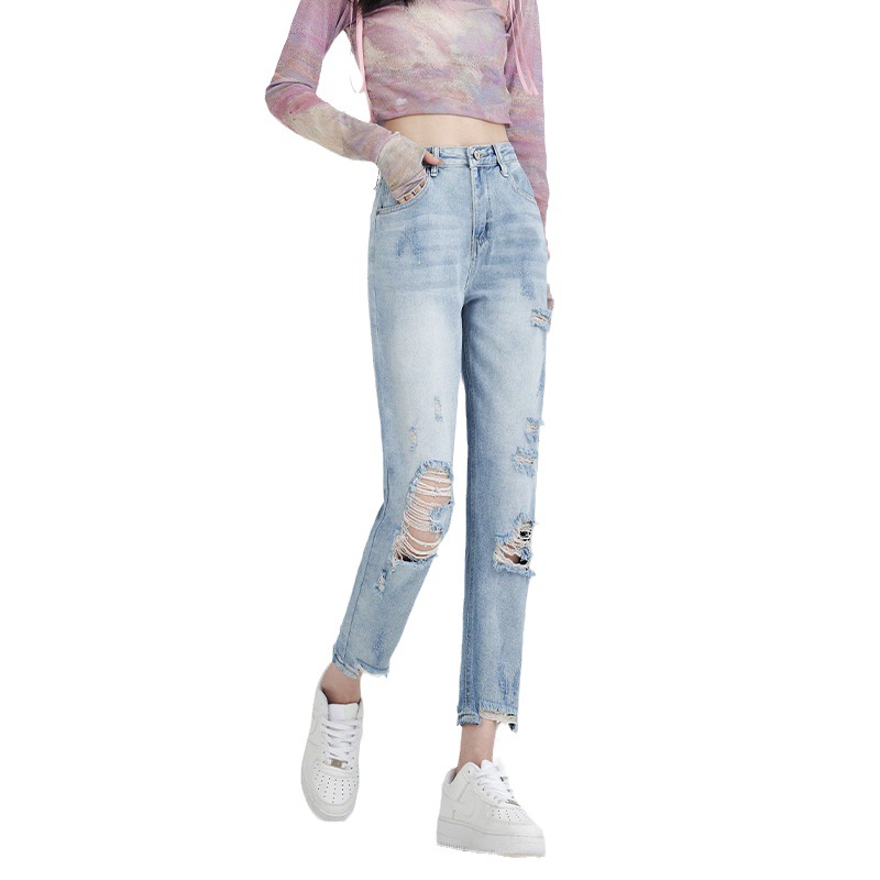 破洞牛仔裤女款早秋新款高腰修身显瘦小个子时尚哈伦裤子