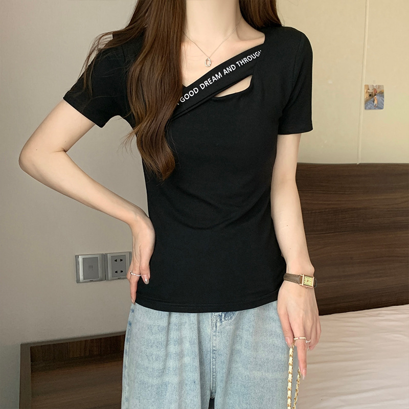 欧货白色正肩t恤女短袖薄款夏季新款低圆领露锁骨心机垫肩上衣潮