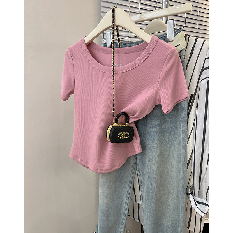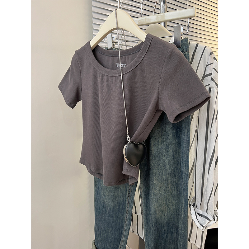 U领灰色百搭短袖T恤女夏季新款美式修身显瘦半袖上衣低领正肩桖