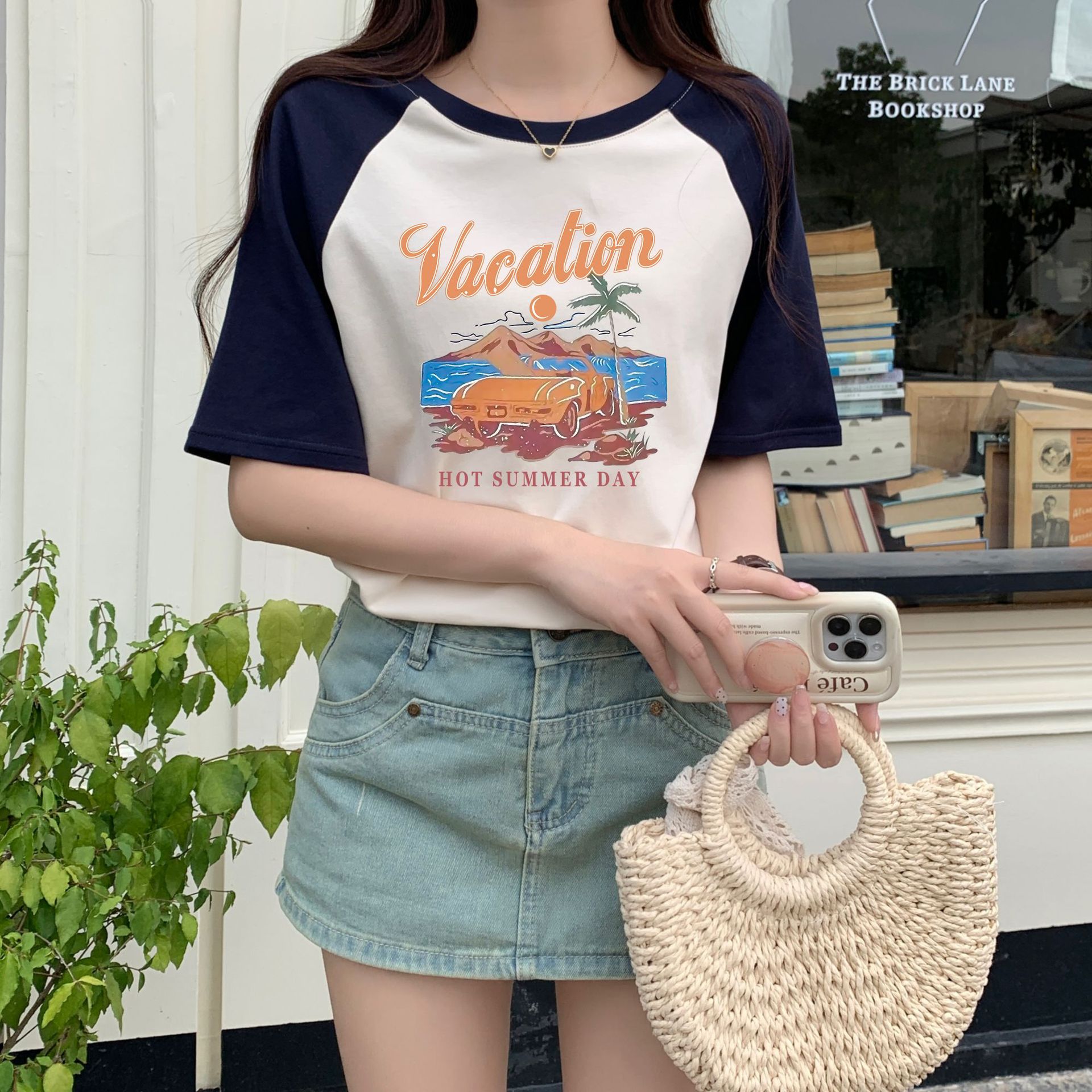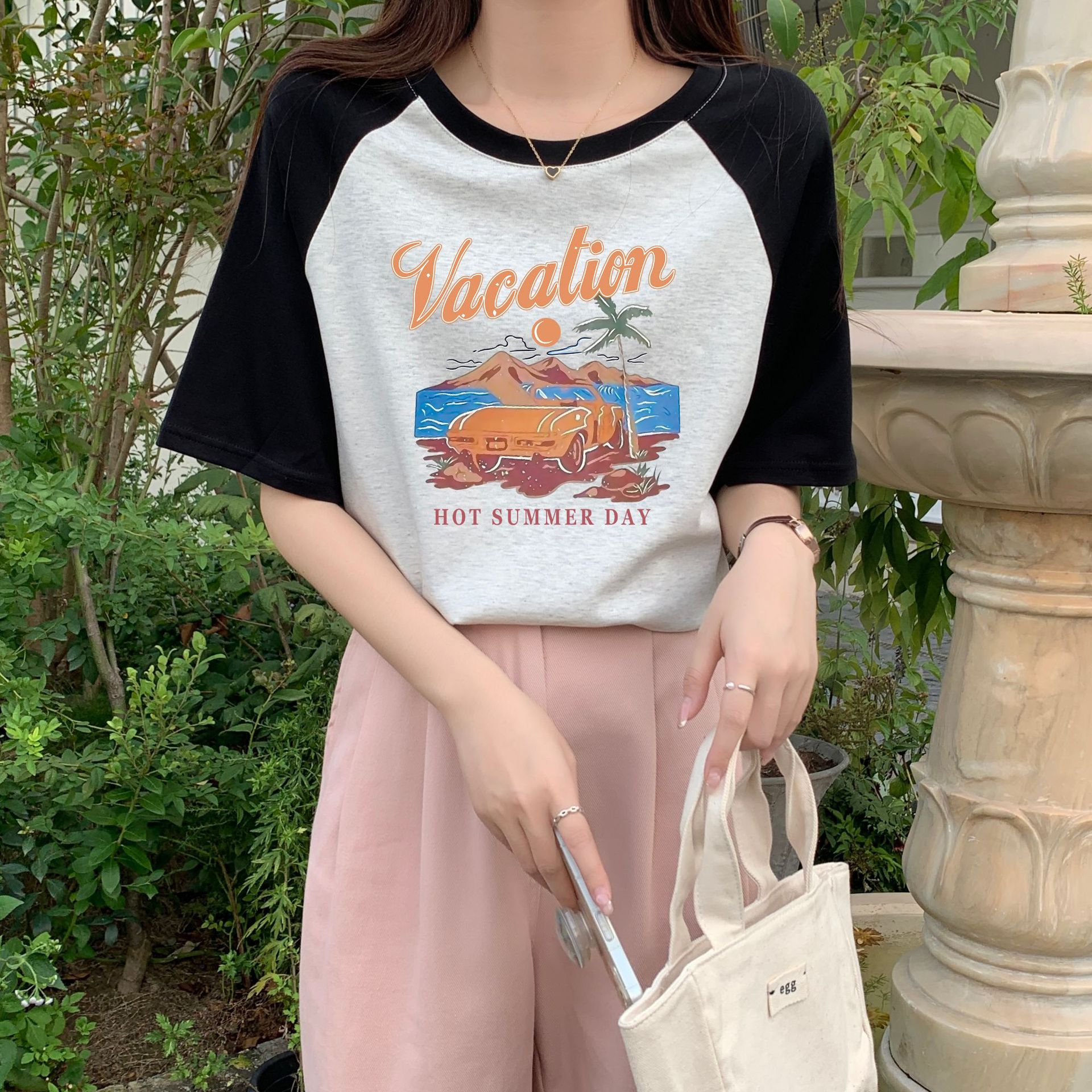 欧货美式复古宽松上衣夏季拼接设计感洋气别致短袖t恤女