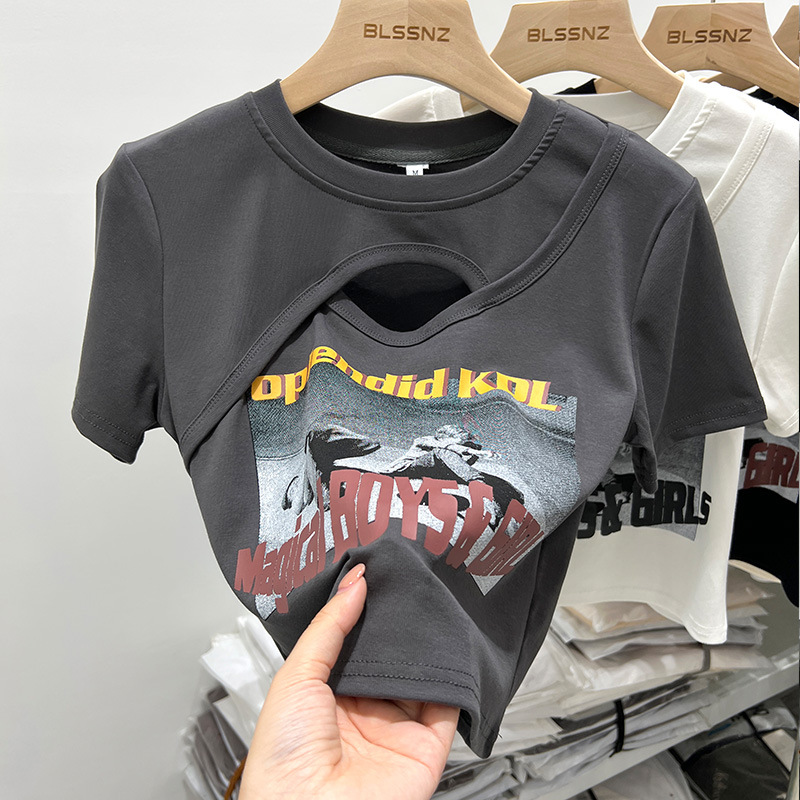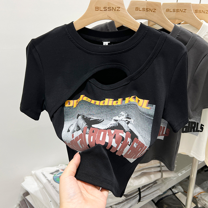 美式复古印花短袖t恤女ins潮夏季纯欲别致独特镂空设计感短款