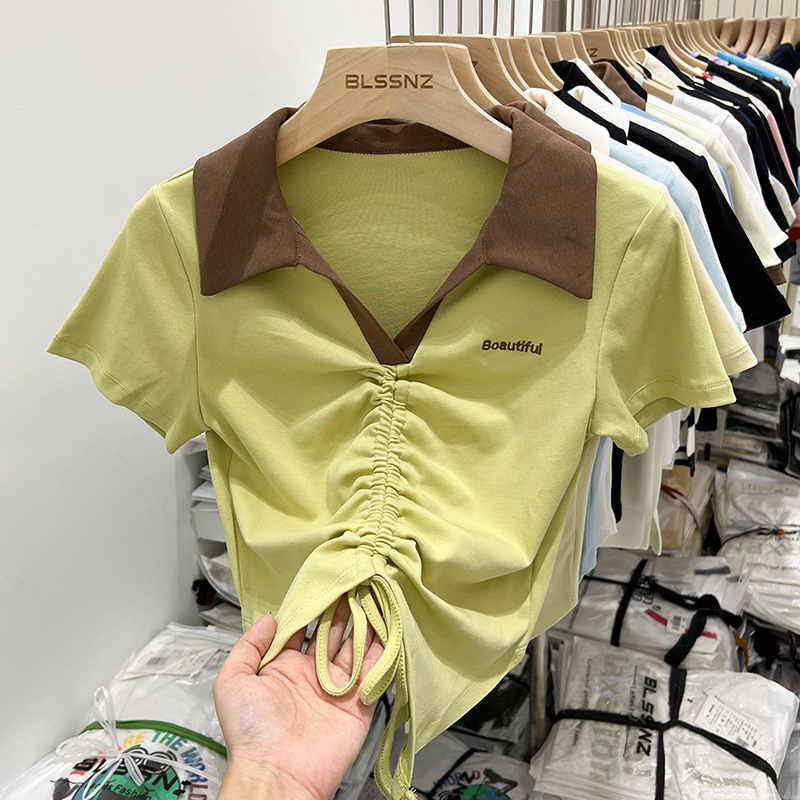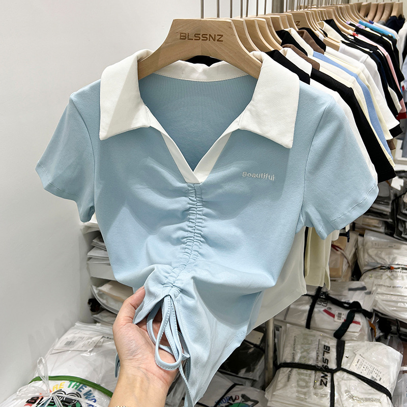 夏季新款纯欲风v领短款上衣设计感小众短袖t恤女撞色polo衫潮