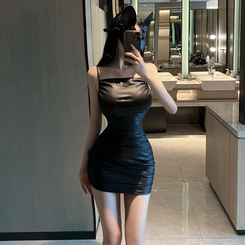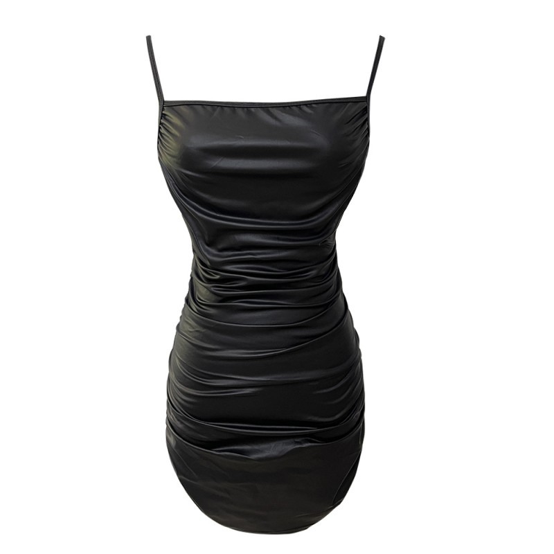 黑色辣妹性感时尚吊带露背简约收腰显瘦仿皮短裙紧身包臀连衣裙女