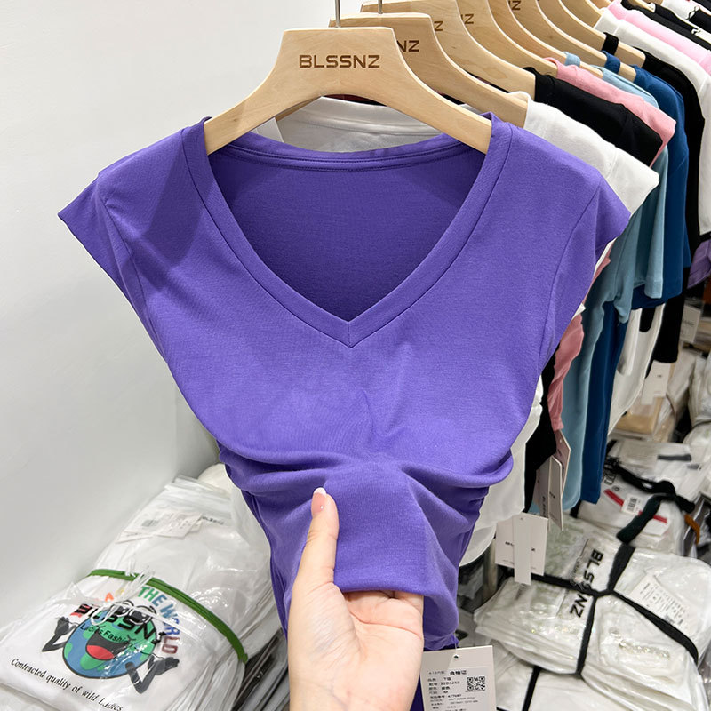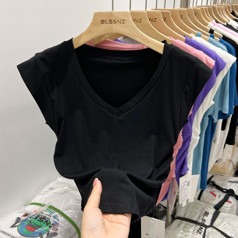 欧货白色v领t恤女修身夏季新款洋气露锁骨心机短款无袖上衣潮
