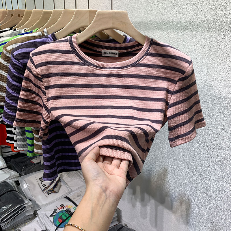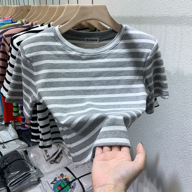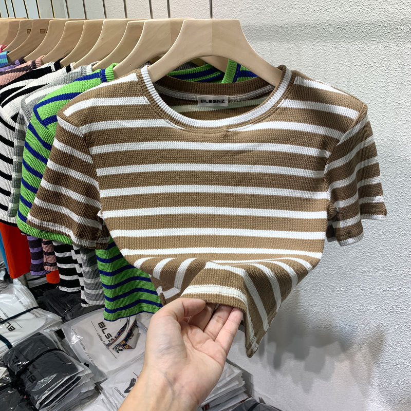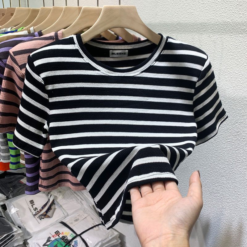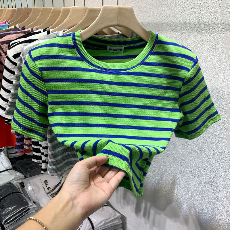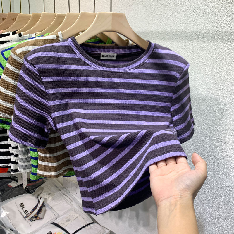 美式复古条纹正肩短袖t恤女夏季卡腰小衫短款垫肩上衣设计感小众