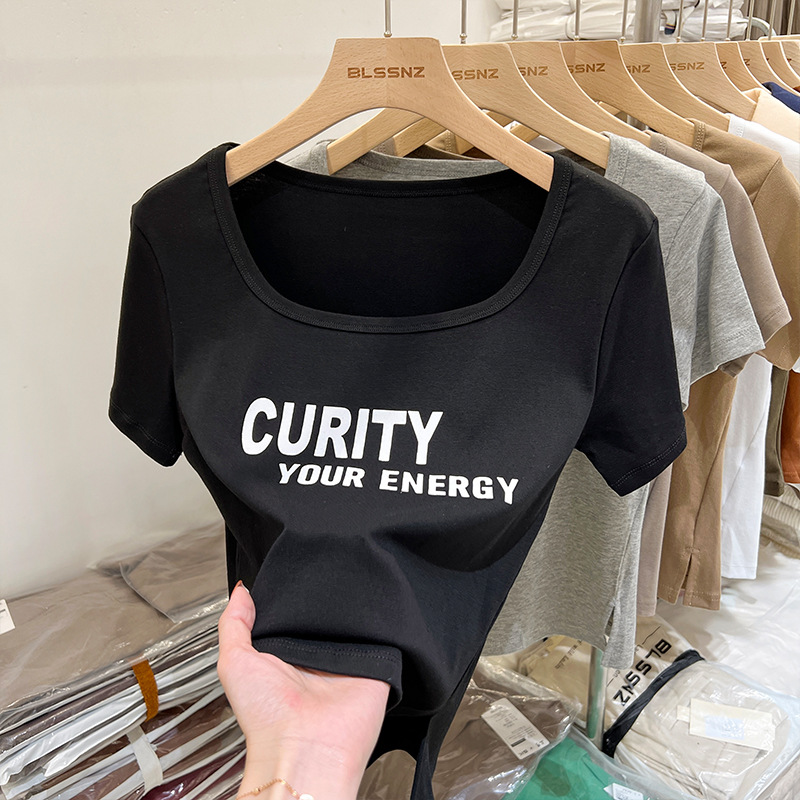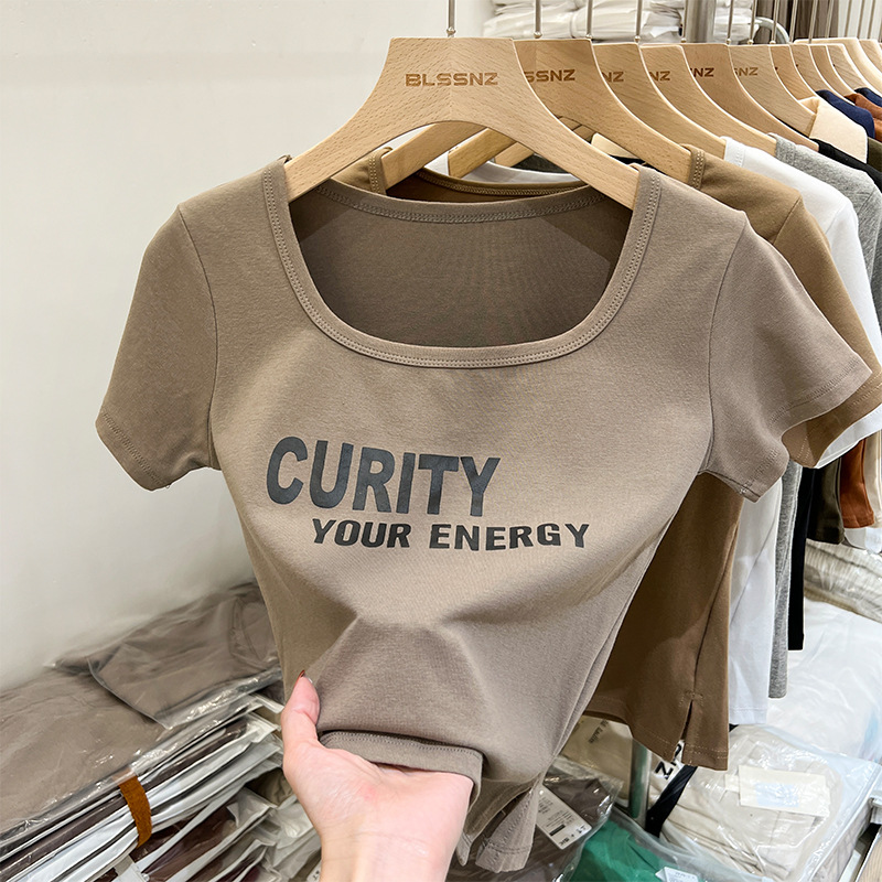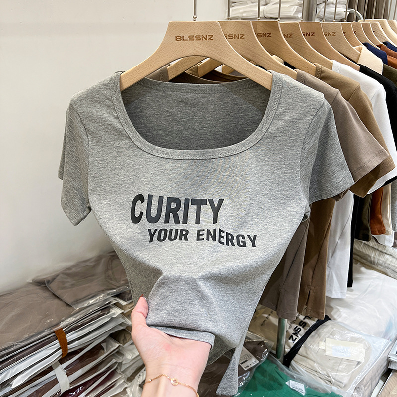 美式复古U领正肩短袖T恤女夏2025新款设计感小众修身短款上衣