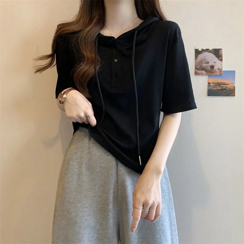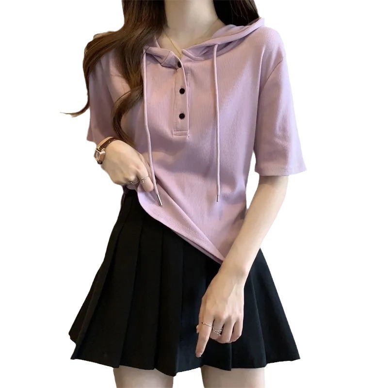 高档夏季韩版新款连帽短袖t恤女显瘦遮肚休闲上衣女打底衫潮
