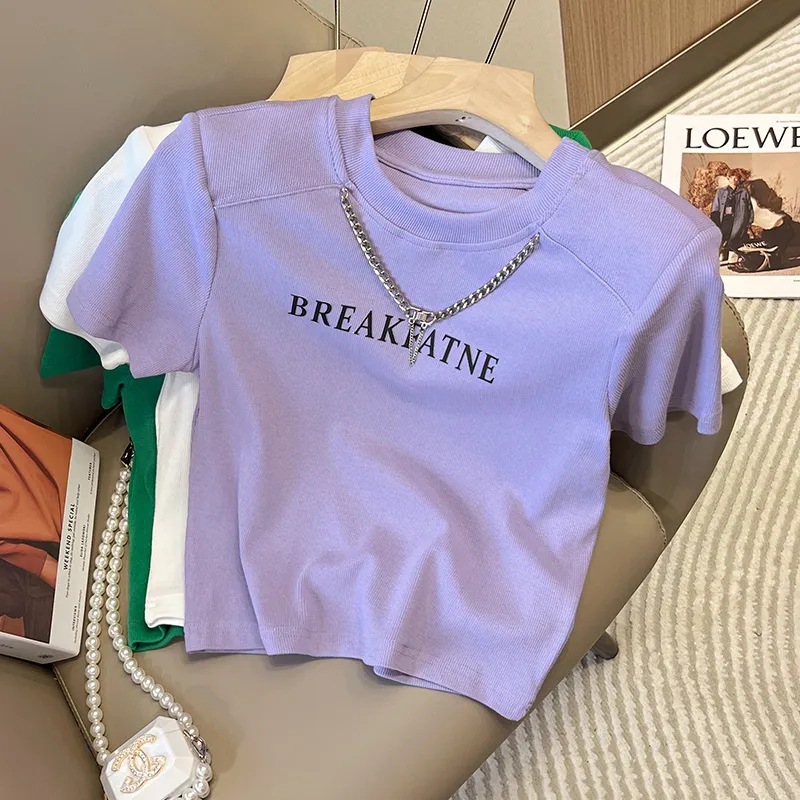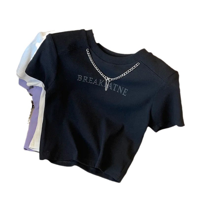 欧货带链条字母短袖t恤女学生夏季新款设计感小众短款百搭上衣潮