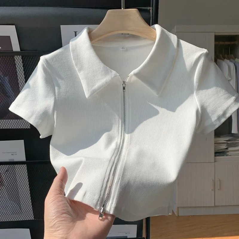 新款纯色polo翻领短袖T恤女夏季设计感双拉链修身短款打底衫