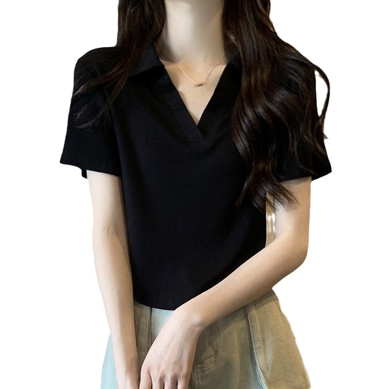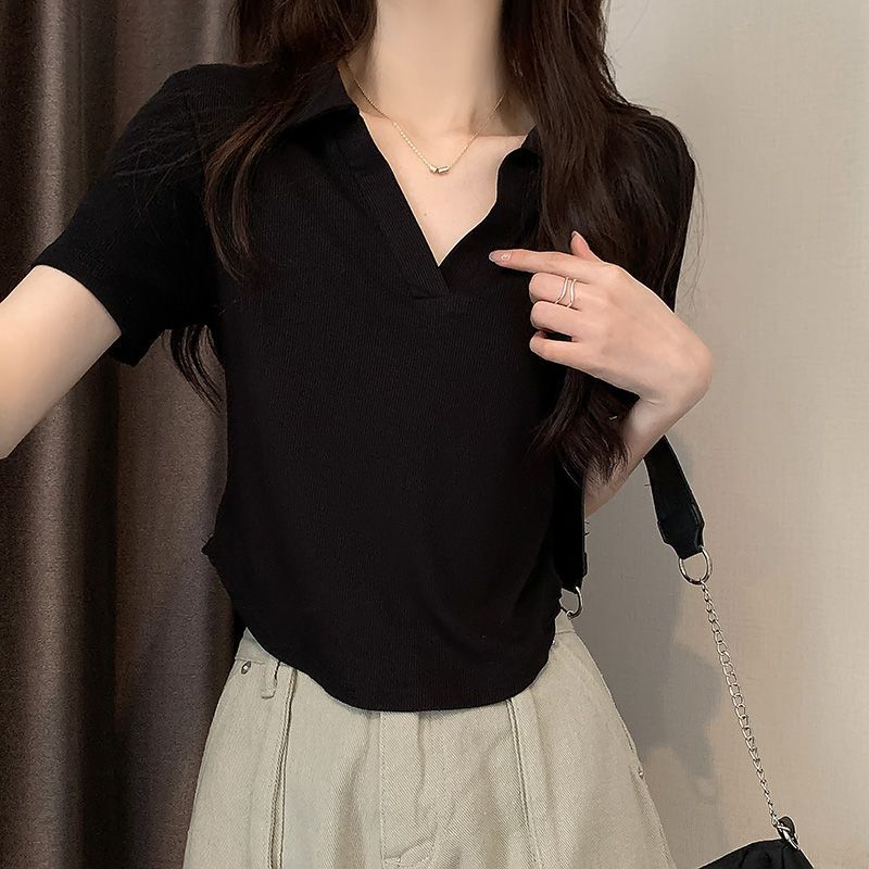 绿色修身polo领纯色小众短袖T恤女春夏新款欧货设计感上衣ins