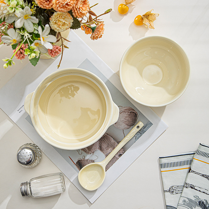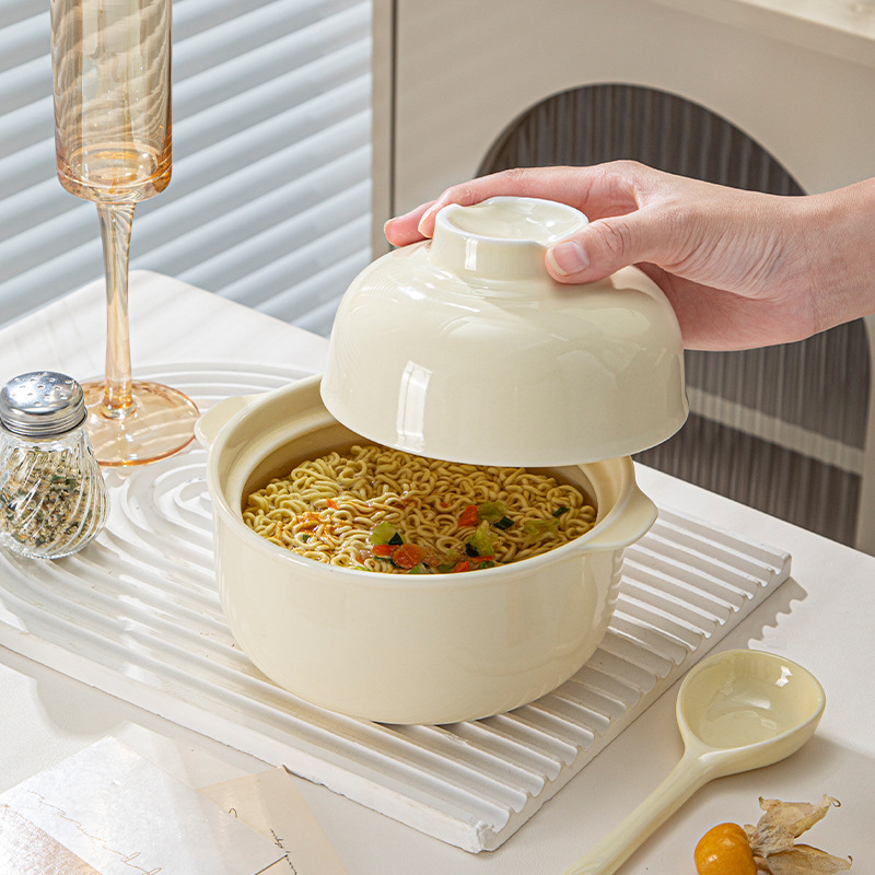 奶油陶瓷泡面碗带盖大号面碗创意学生宿舍饭盒可爱家用陶瓷碗勺