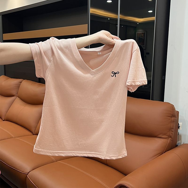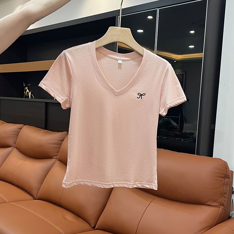 新款短袖T恤女夏季蝴蝶结设计刺绣修身显瘦百搭上衣