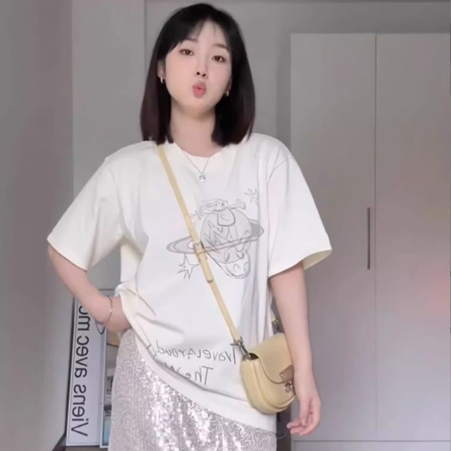 免子印花正肩短袖T恤女夏季薄款韩系设计感小众宽松莫代尔上衣潮