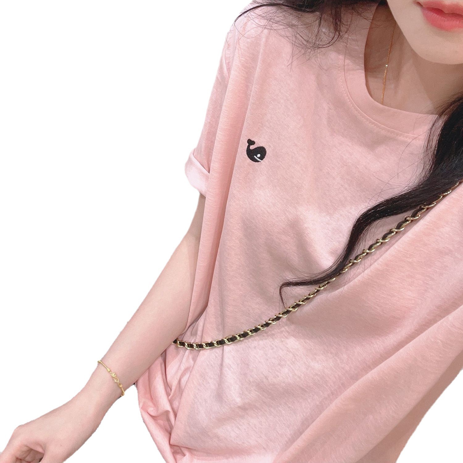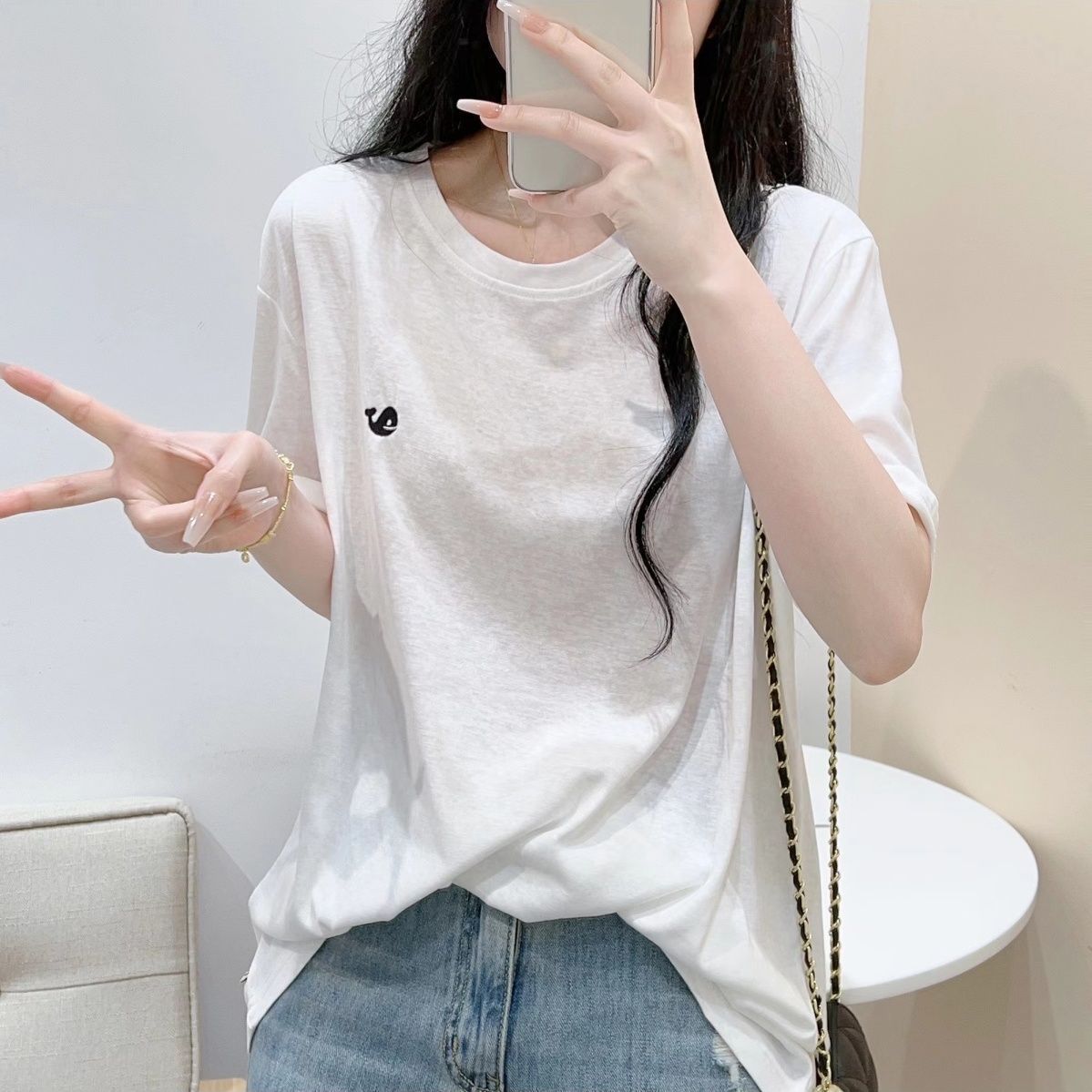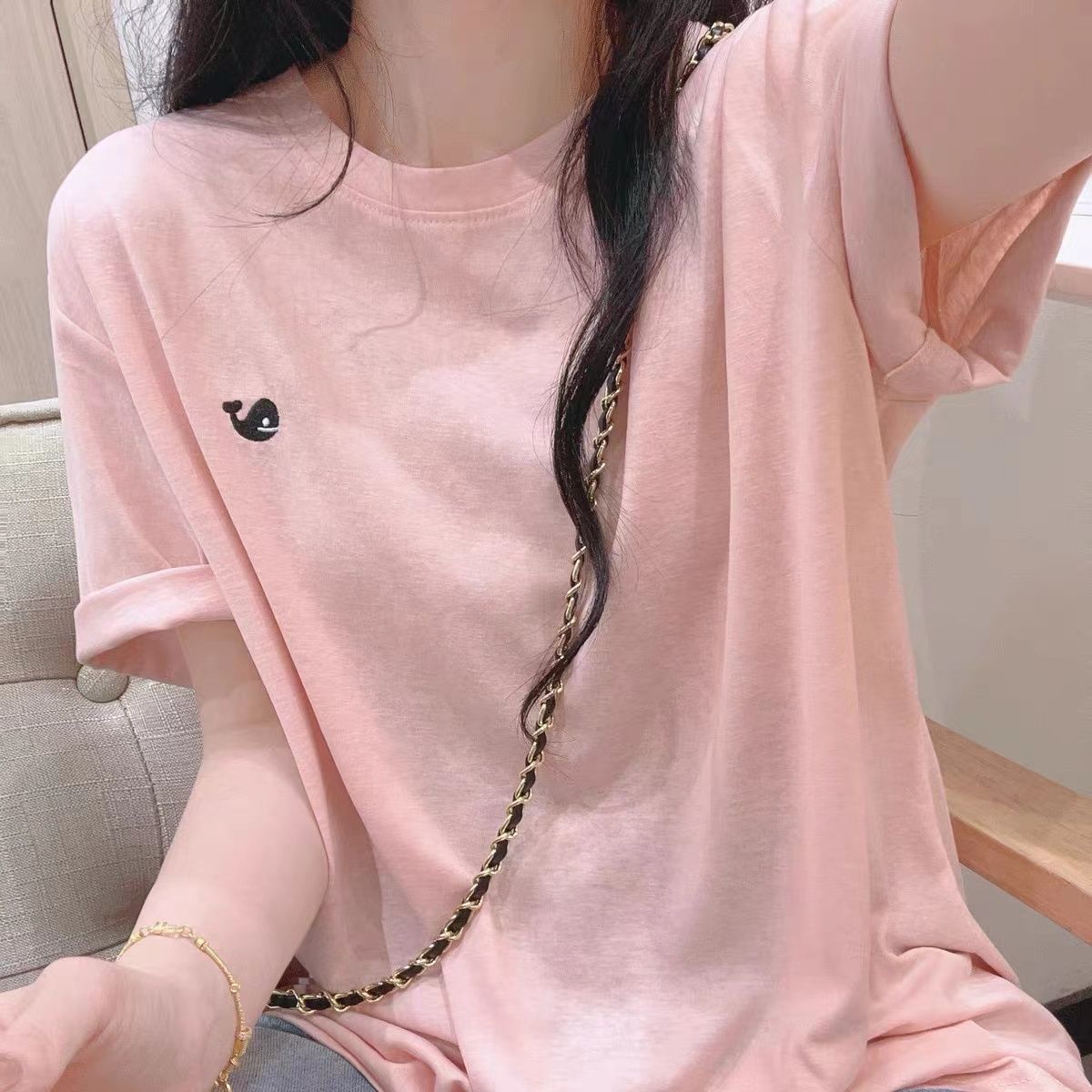 圆领刺绣竹节棉粉色短袖T恤女装夏天宽松显瘦正肩基础款上衣