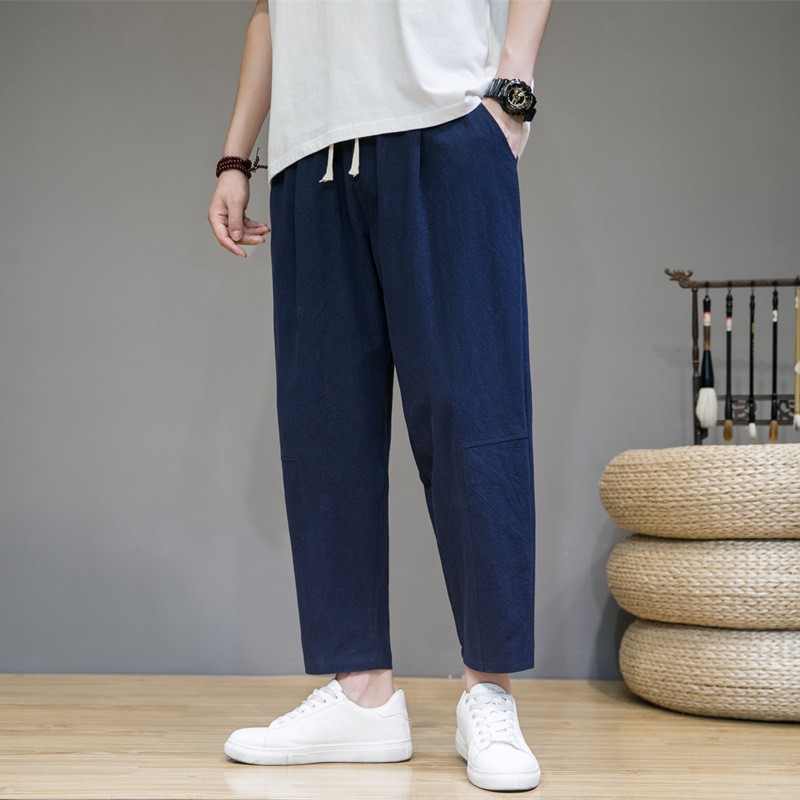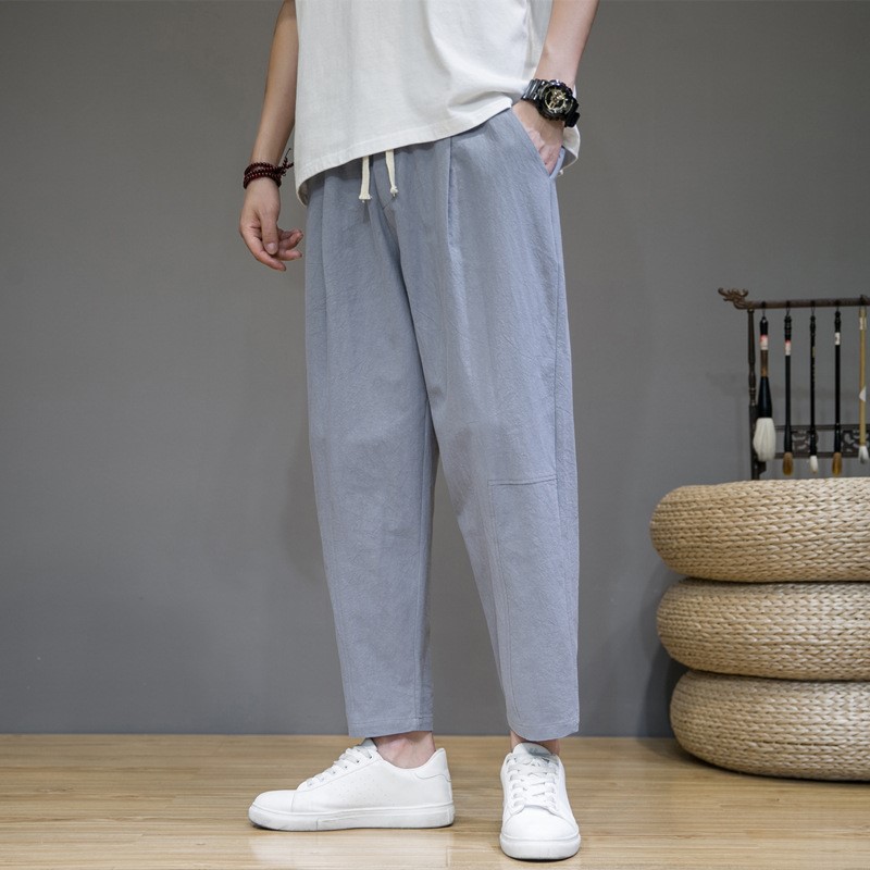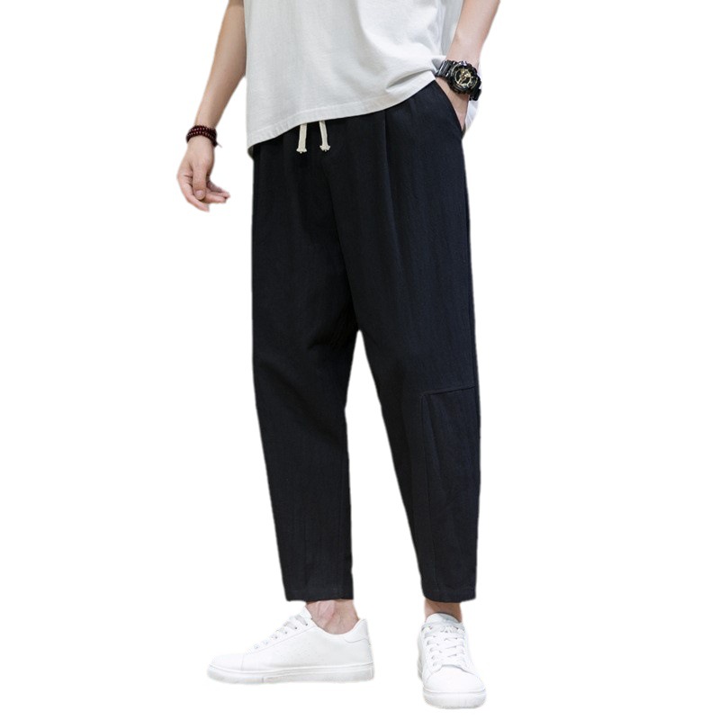 夏季新款中国风男士纯色棉麻宽松九分裤青年时尚潮流休闲运动裤