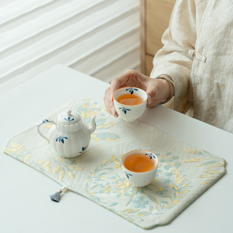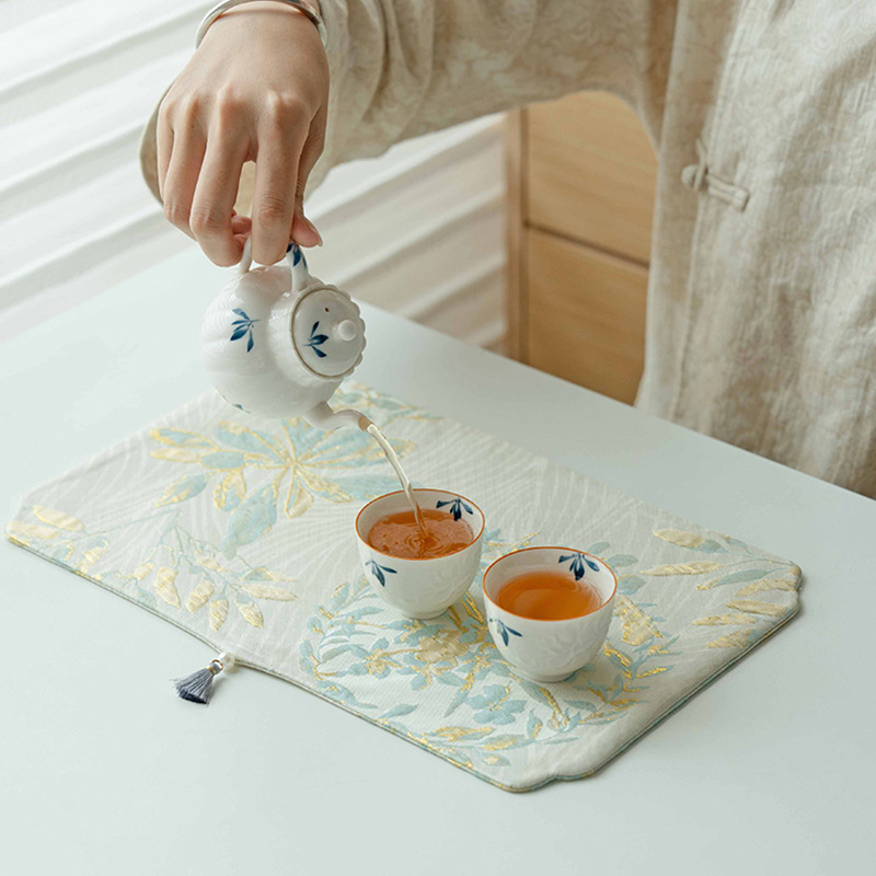 金丝梨花白茶席茶垫新中式禅意双面轻奢高级感桌旗桌布茶杯垫