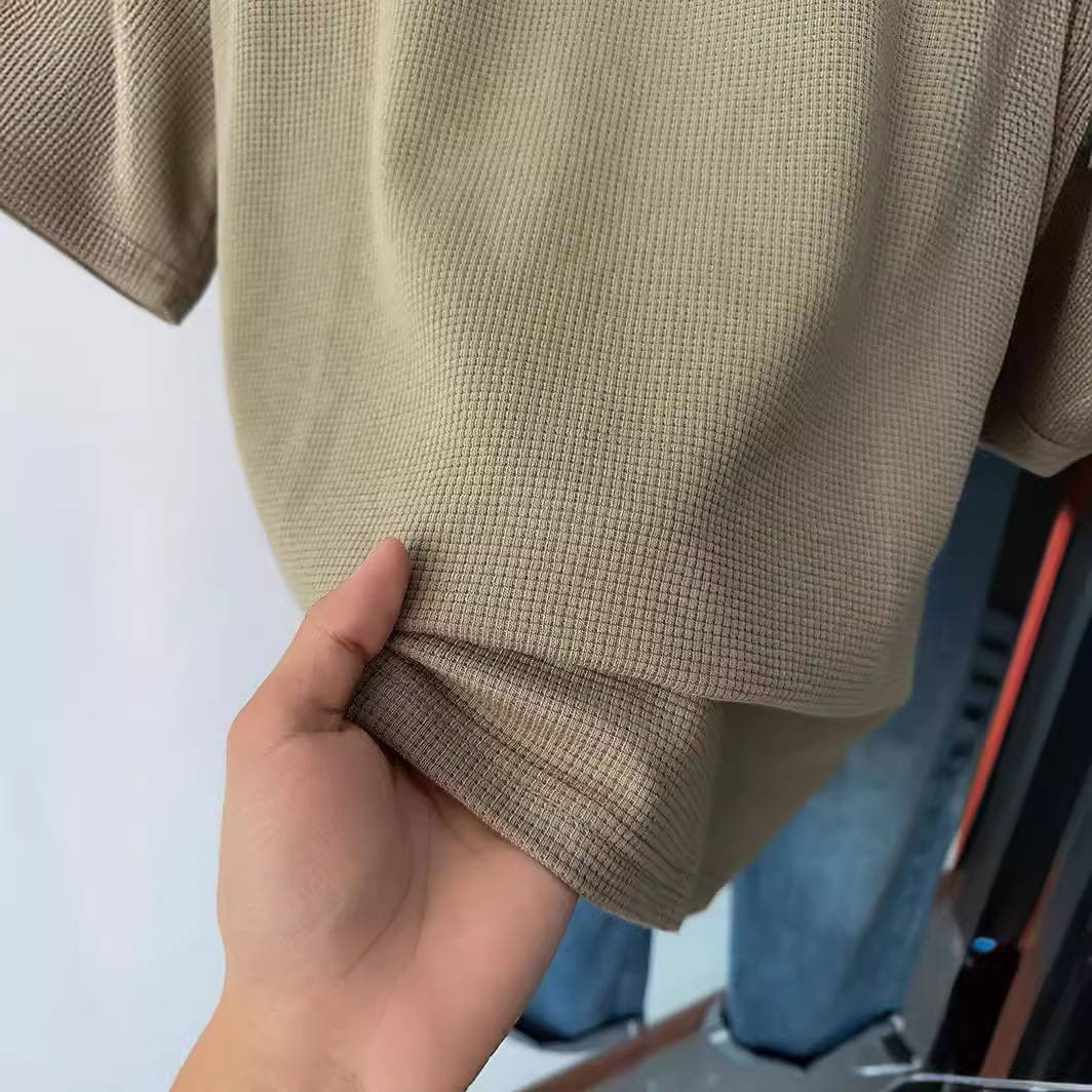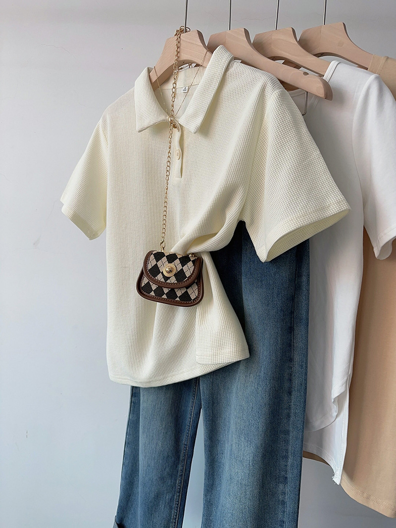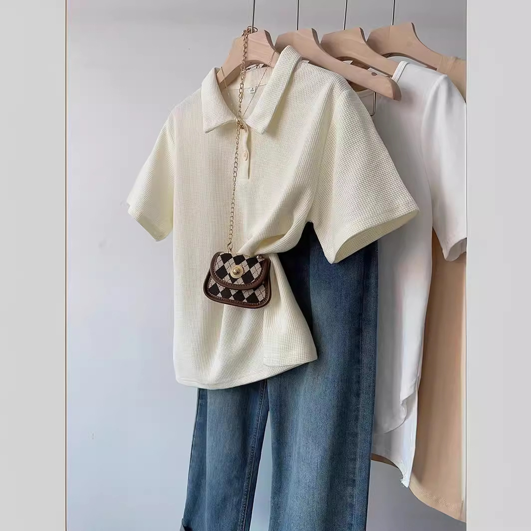 Polo翻领短袖t恤女宽松正肩夏季半袖新款纯色华夫格打底上衣
