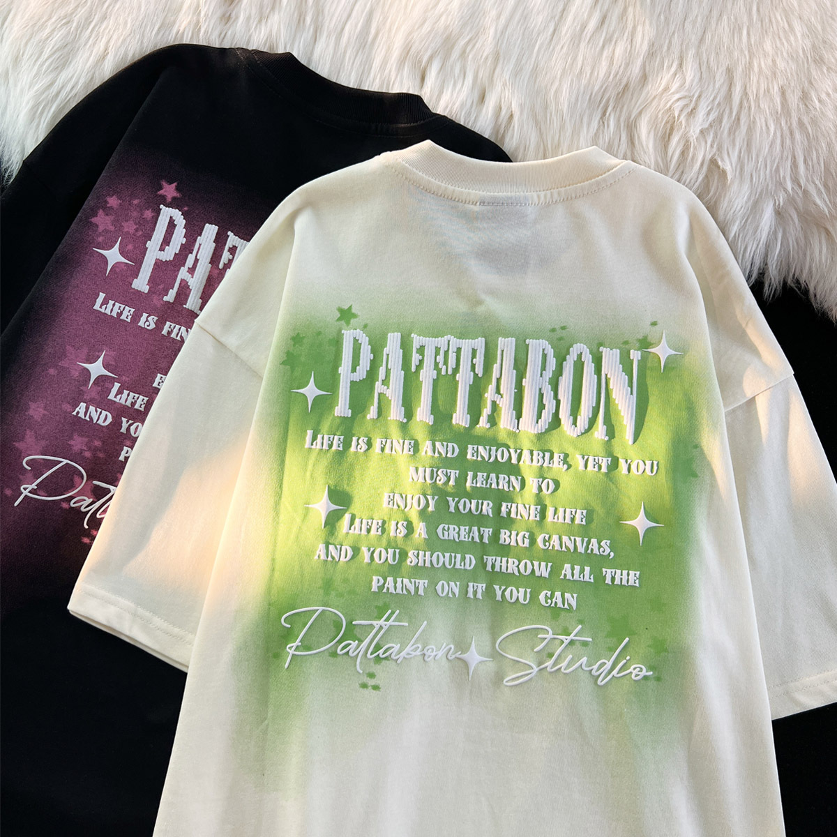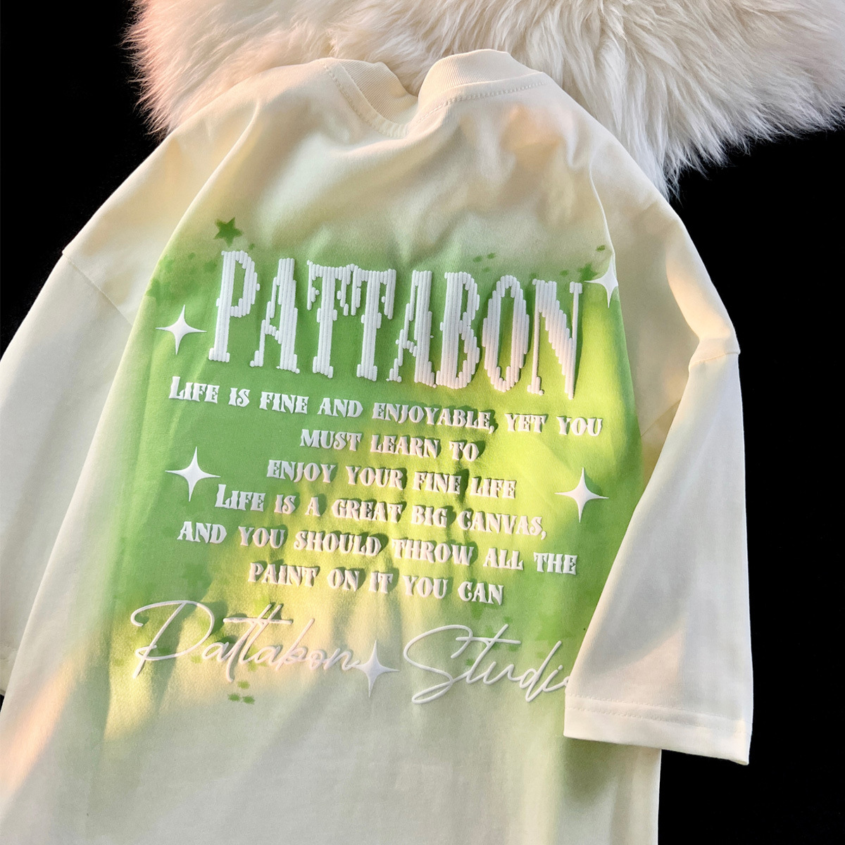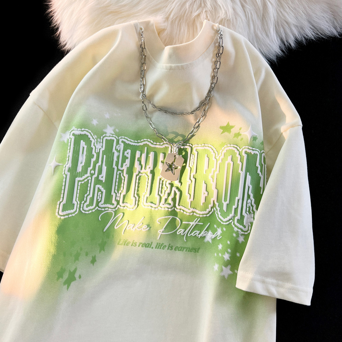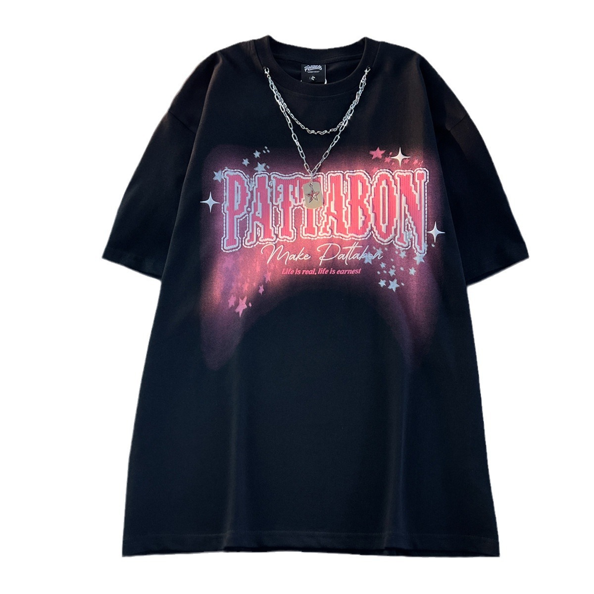 美式复古星星发泡印花带项链短袖t恤女宽松潮牌ins半袖情侣上衣