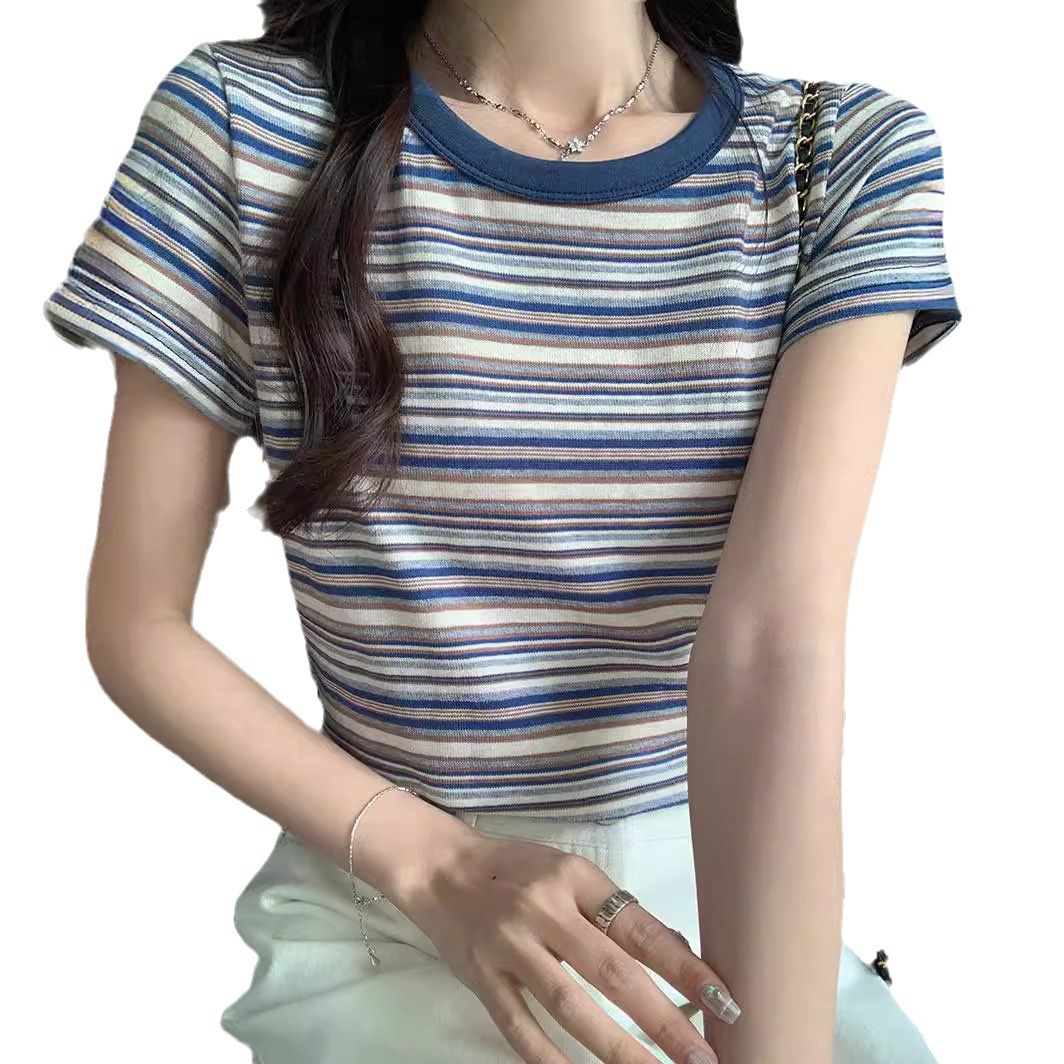 夏季新款港味复古正肩短袖t恤女小个子撞色条纹减龄上衣体恤