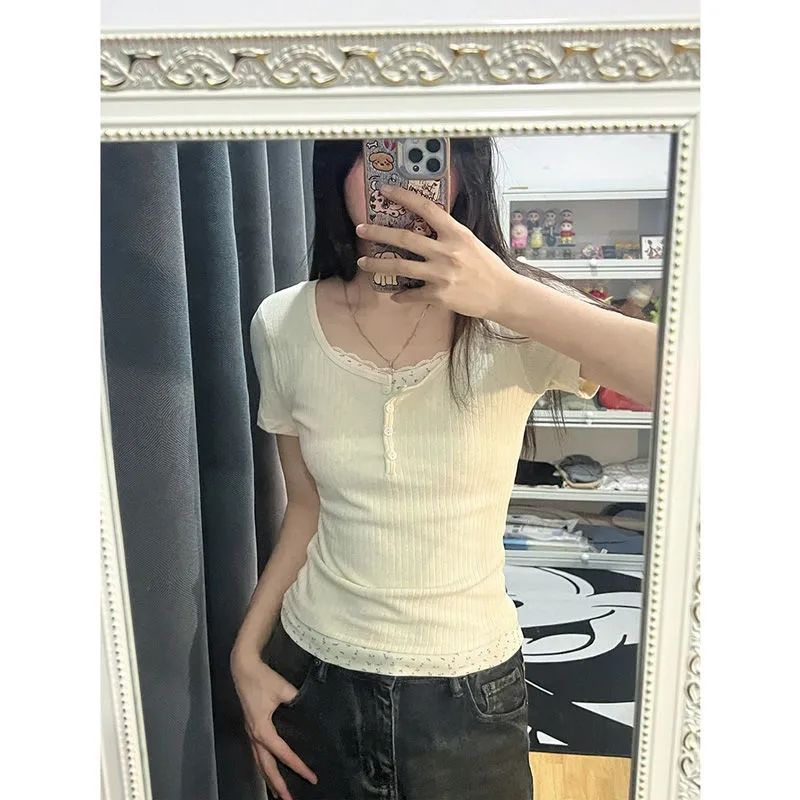 纯欲风甜辣妹碎花假两件蕾丝花边短袖春夏收腰显瘦修身上衣潮