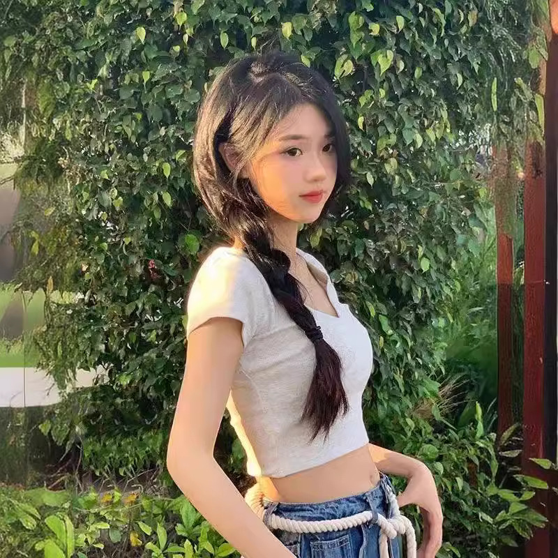 V领绣花甜辣妹夏季新款短款莫代尔上衣短袖t恤女修身百搭显瘦高腰
